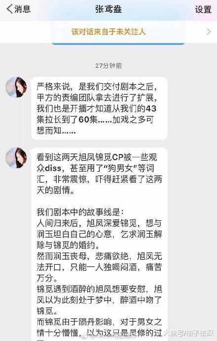 近日,有网友曝光与《香蜜沉沉烬如霜》编剧张鸢盎的聊天截图,截图显示原定为43集的《香蜜》,在剧本已经给了男女主演的情况下,剧本还在另一个编剧团队手上不断修改,最终从43集被加到60集,严重注水。