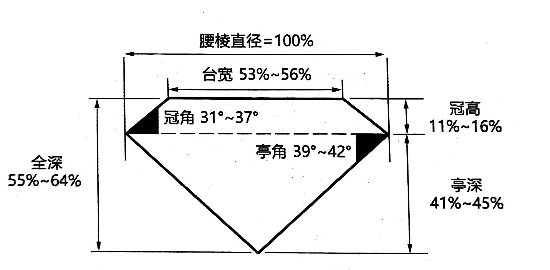 如今的珠宝市场,钻石切磨仍以圆形为主,为最大化展现钻石的明亮度与火彩,标准圆钻型切工(标准圆明亮琢型) 成为主流。这种切工轮廓为圆形,按特定角度切割出 57 或 58 个刻面,整体由冠部、腰棱、亭部三部分构成:冠部含 33 个刻面,包含 1 个台面、8 个星刻面、8 个冠部主刻面和 16 个上腰小面;亭部有 24 个刻面,为 8 个亭部主刻面加 16 个下腰小面,亭部底尖若磨成小刻面,刻面总数便为 58 个。