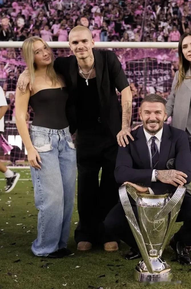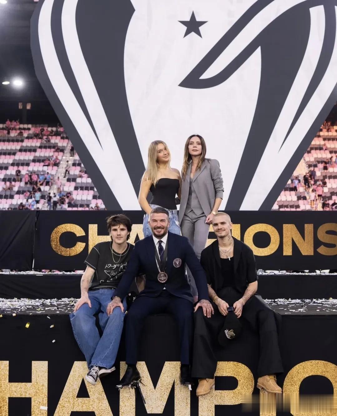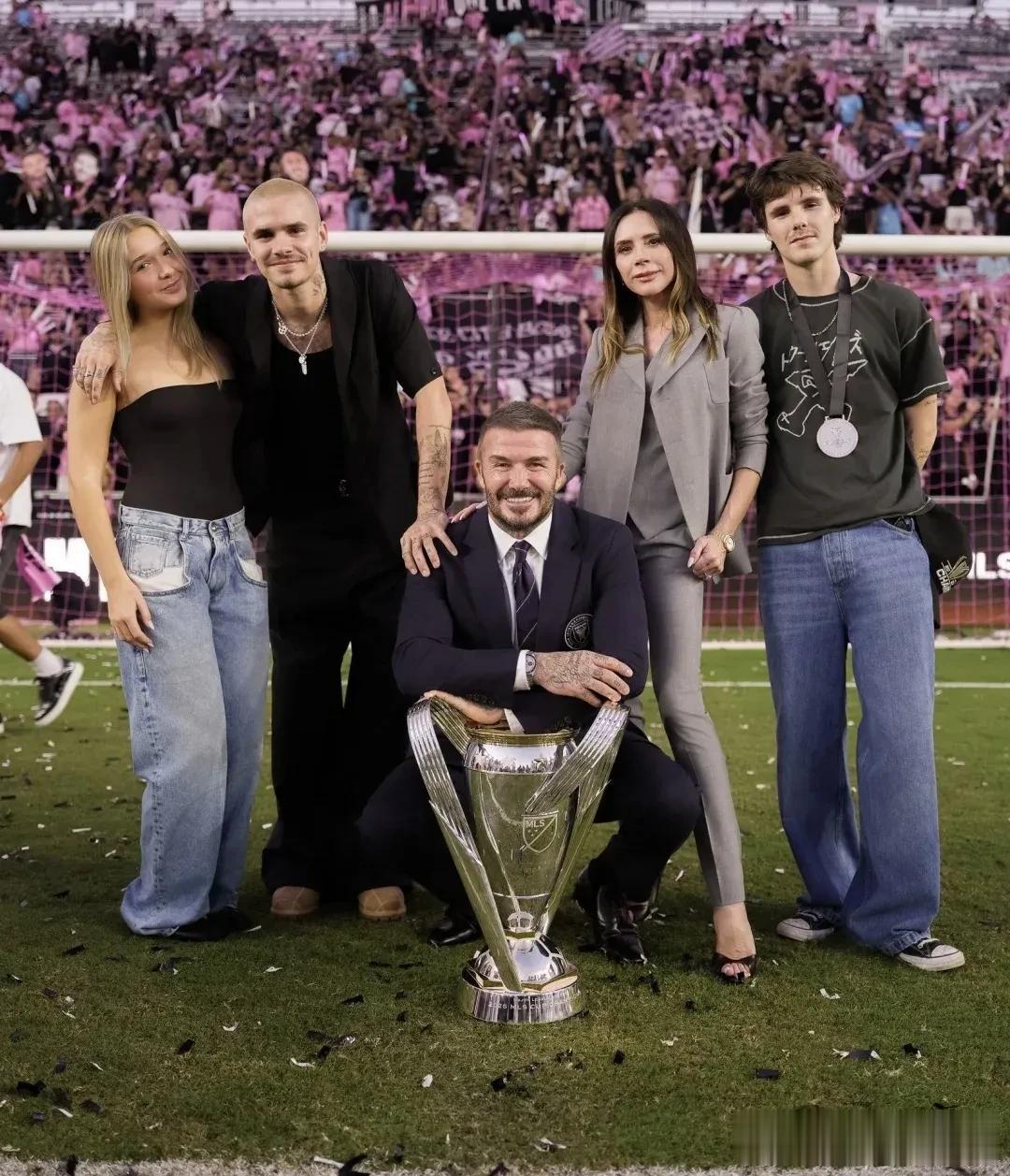 贝克汉姆一身西装革履,眉开眼笑的举起了这尊奖杯,妻子维多利亚和三个孩子一起陪老爸见证了这一激动人心的时刻。