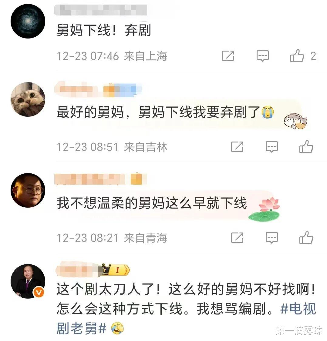 《老舅》的定位是年代轻喜剧,可是,由于舅妈的车祸离世,喜剧还是变成了悲剧。对此,一些舍不得舅妈的观众,除了表示不理解、难以接受和泪目,除了对崔国明不满外,甚至表示要弃剧不追了。
