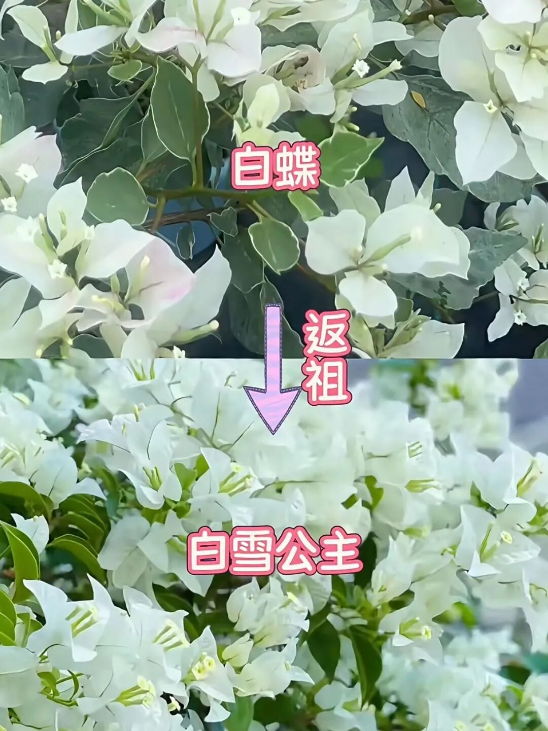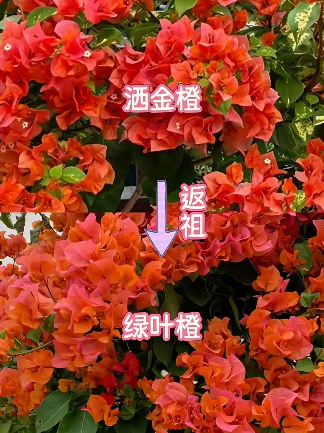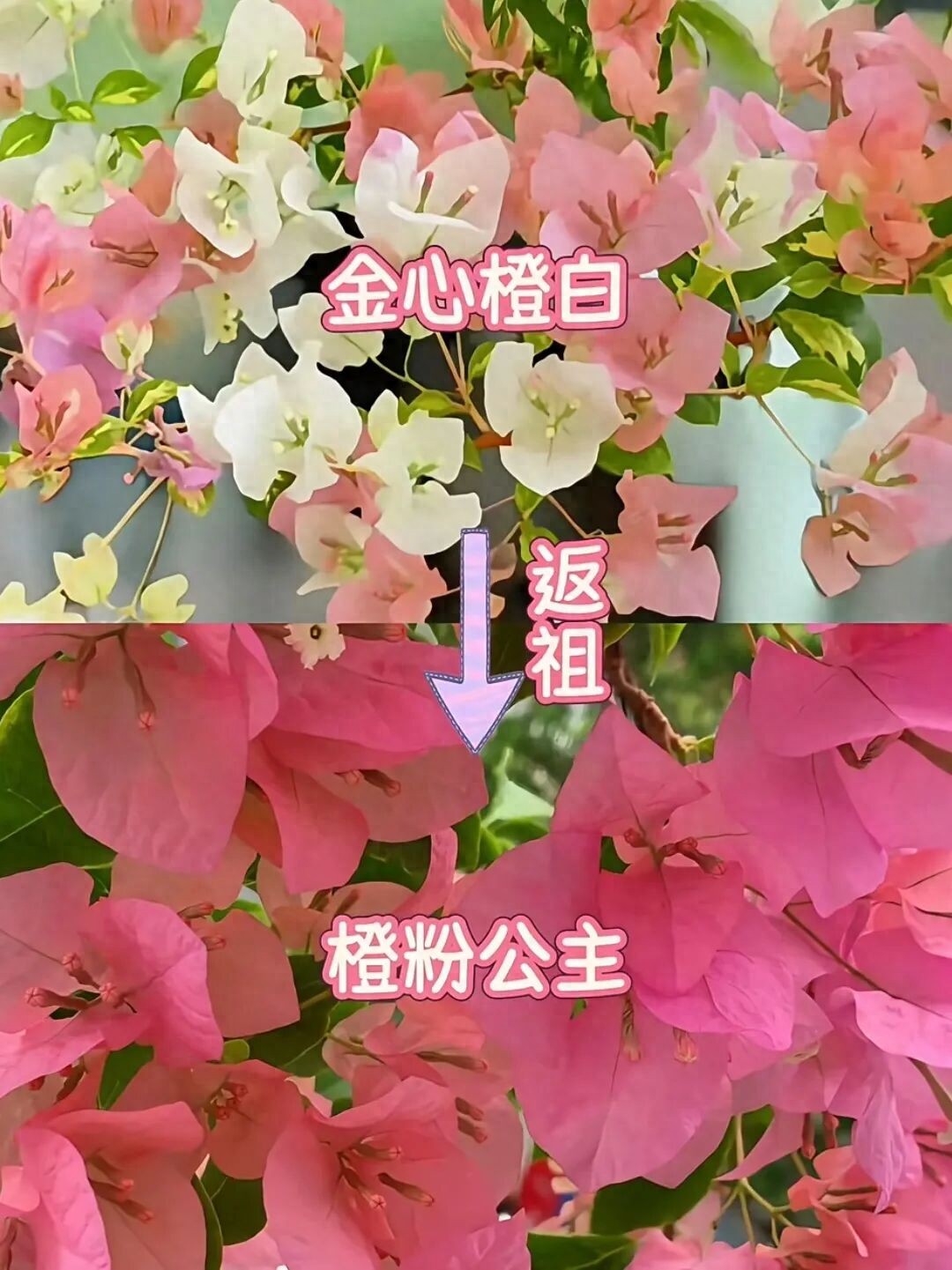 三角梅养久了,大多数花友都会遇到三角梅返祖的情况,养着养着有一些品种就变成了另外一个品种,今天分享8款容易返祖的三角梅及返祖后的品种。 1. 金心橙白 ↔ 橙粉公主