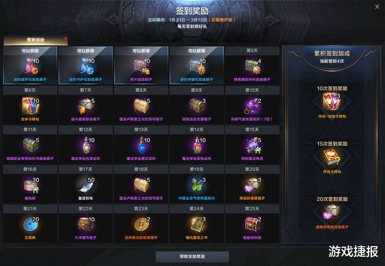 更有春节期间的签到奖励,不仅有精炼材料、银币、染色剂、航海硬币、交易牌和维他纳等实用道具领取,在签到15次还能免费领取【传说卡牌包】!