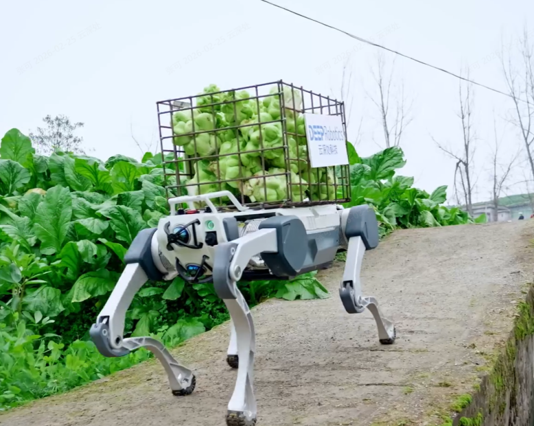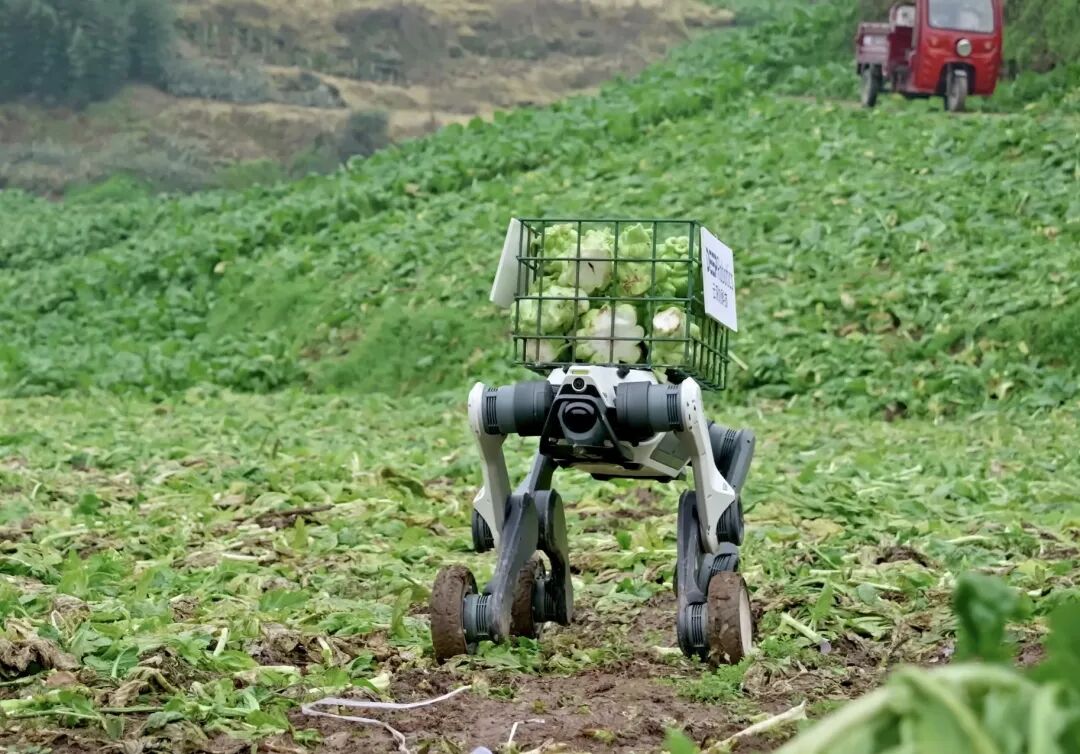 而很少有人刷到这样一幕:重庆涪陵的阴雨泥地里,一台四足机器人驮着满满一筐青菜头头—— 这些青菜头,正是我们常吃的涪陵榨菜的核心原料,在宽不到 40 厘米的湿滑田埂上稳步前行,身后是菜农松了一口气的朴实夸赞:“总算不用肩扛了,这机器是真能解决问题。”