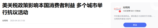 光明网2025-04-20——美关税政策影响本国消费者利益 多个城市举行抗议活动