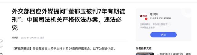 外交部回应外媒提问“董郁玉被判7年有期徒刑”:中国司法机关严格依法办案,违法必究环球网