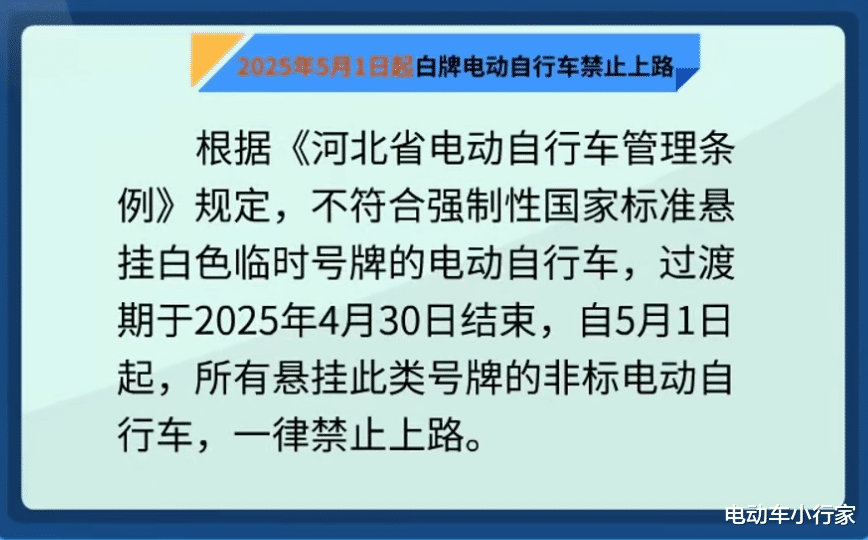 电动车悬挂白底黑字牌照的代表城市:河北石家庄等地悬挂白底黑字牌照,根据《河北省电动自行车管理条例》,不符合国标的白色临时号牌,过渡期将于2025年4月30日结束,自5月1日起,悬挂此类号牌的非标电动自行车,一律禁止上路。