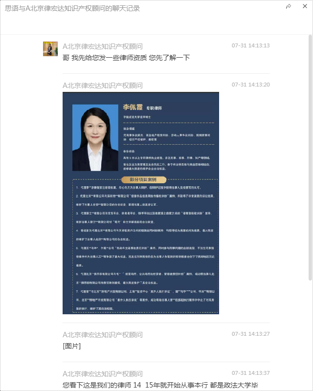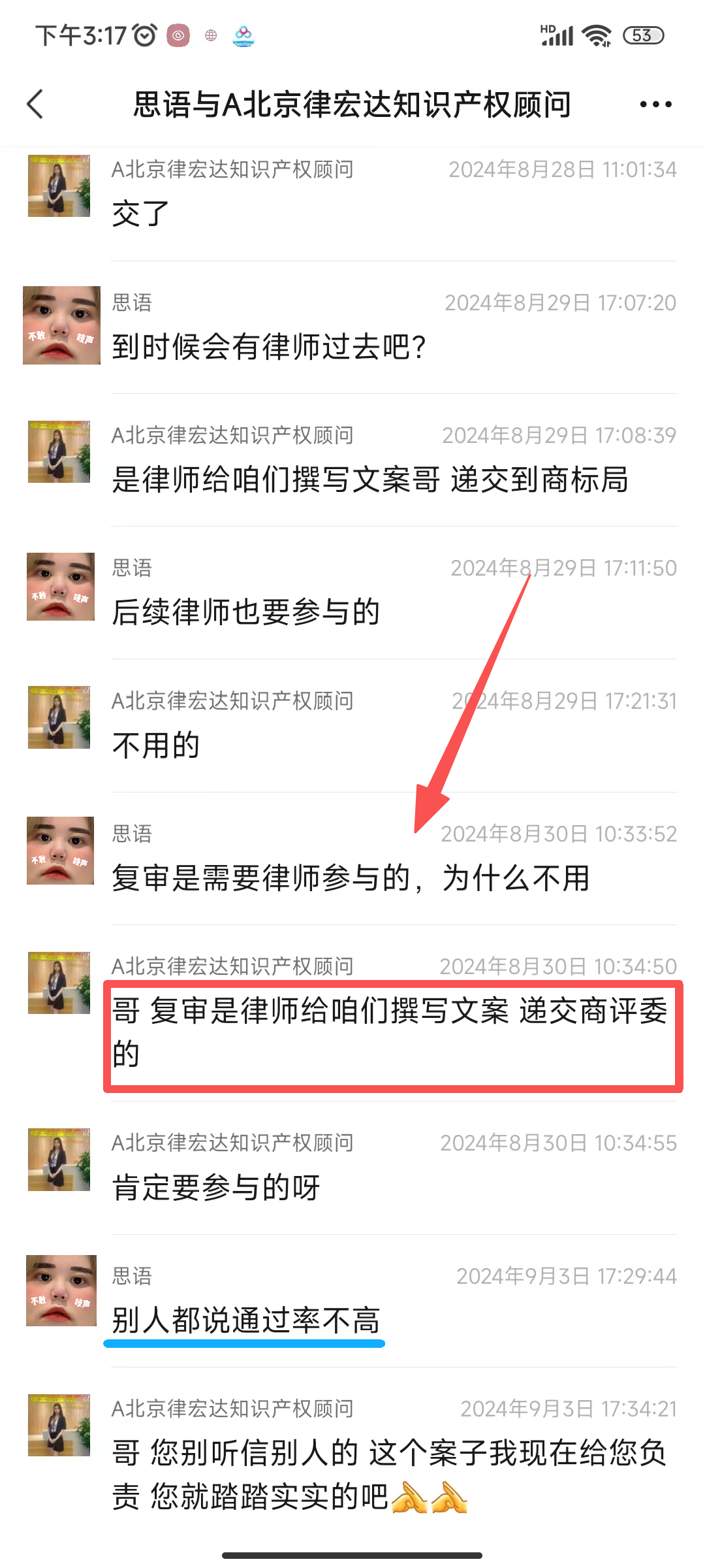 复审过程中,律宏达不断向我传递“流程顺利、只需等待拿证”的积极信息,直至6月25日突然告知复审失败,并称若想取得商标证,只能通过向商标局提起诉讼的方式解决,且需要额外支付高昂的诉讼费