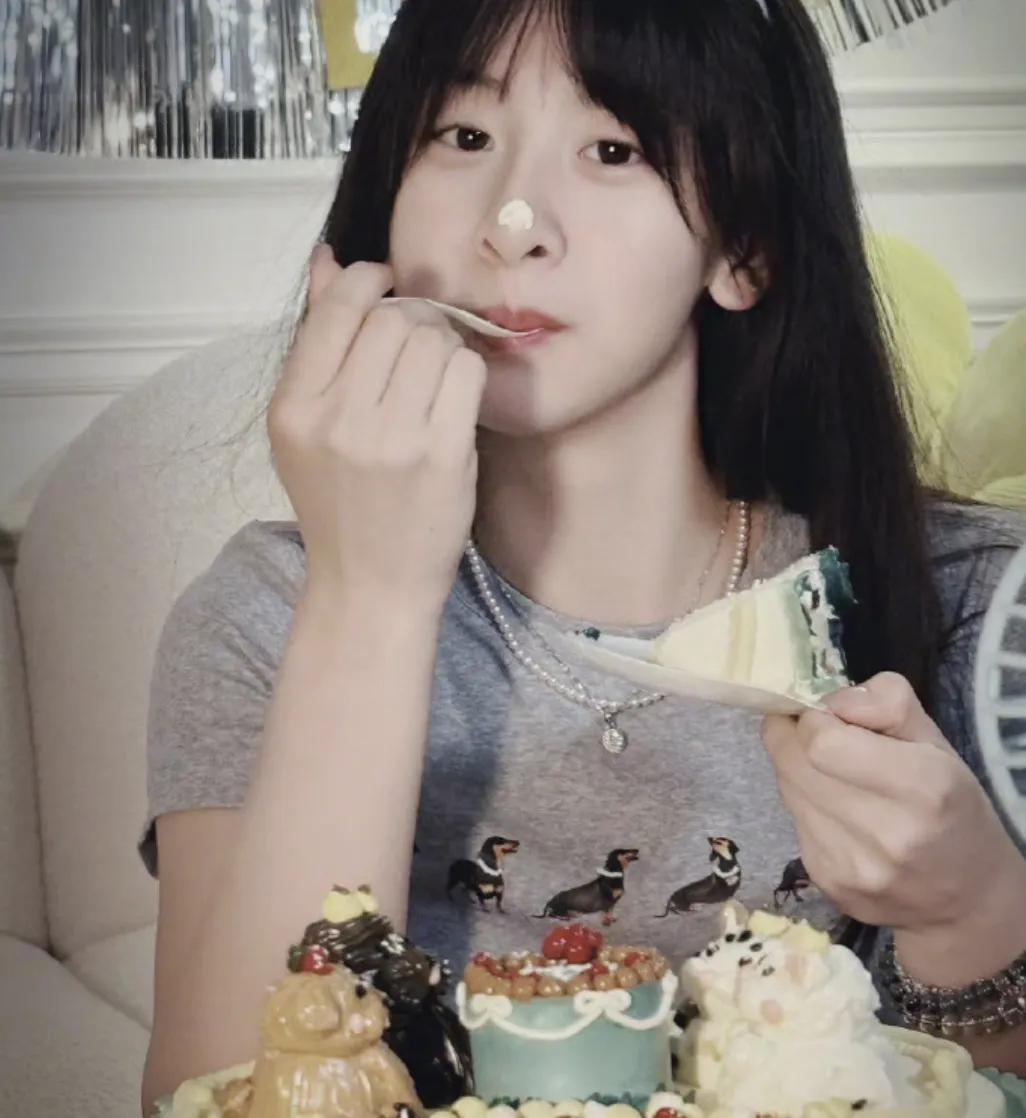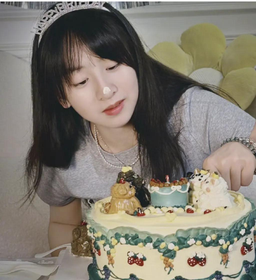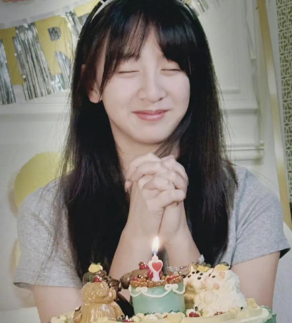 森碟的面前放着一个大蛋糕,森碟还对着蛋糕许愿,心情看着还是很不错的,笑起来的时候,森碟的表情也是很搞笑的,眯着眼睛,目光很们梦幻。