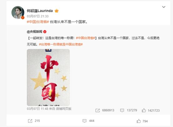 张韶涵、翁虹、张晨光、赵又廷等艺人也不甘落后。张韶涵转发时附上深情话语,表达对祖国统一的热切期盼;翁虹则用充满力量的文字,呼吁更多人守护国家主权;张晨光凭借自身影响力,带动身边人关注这一重要议题;赵又廷的转发同样引发大量粉丝共鸣,彰显出作为公众人物的担当。他们的发声,如同接力棒一般,在娱乐圈传递着维护国家统一的正能量。