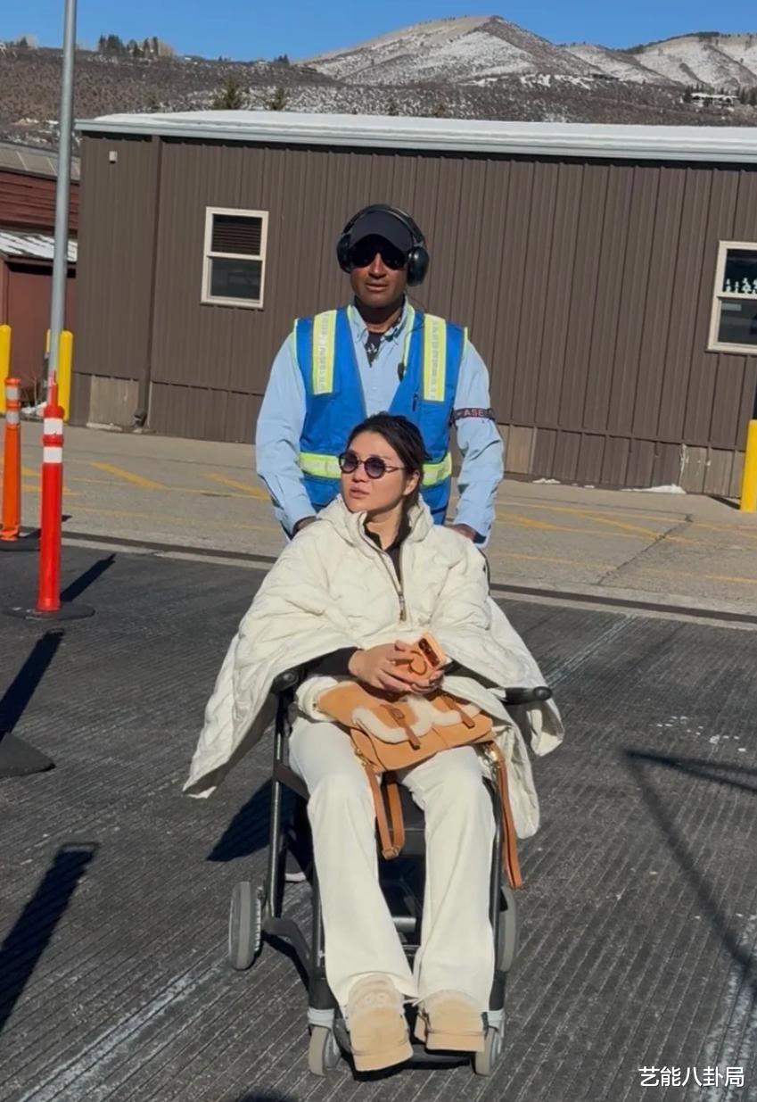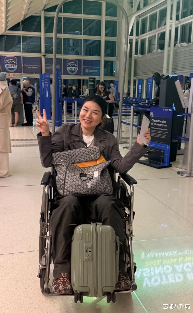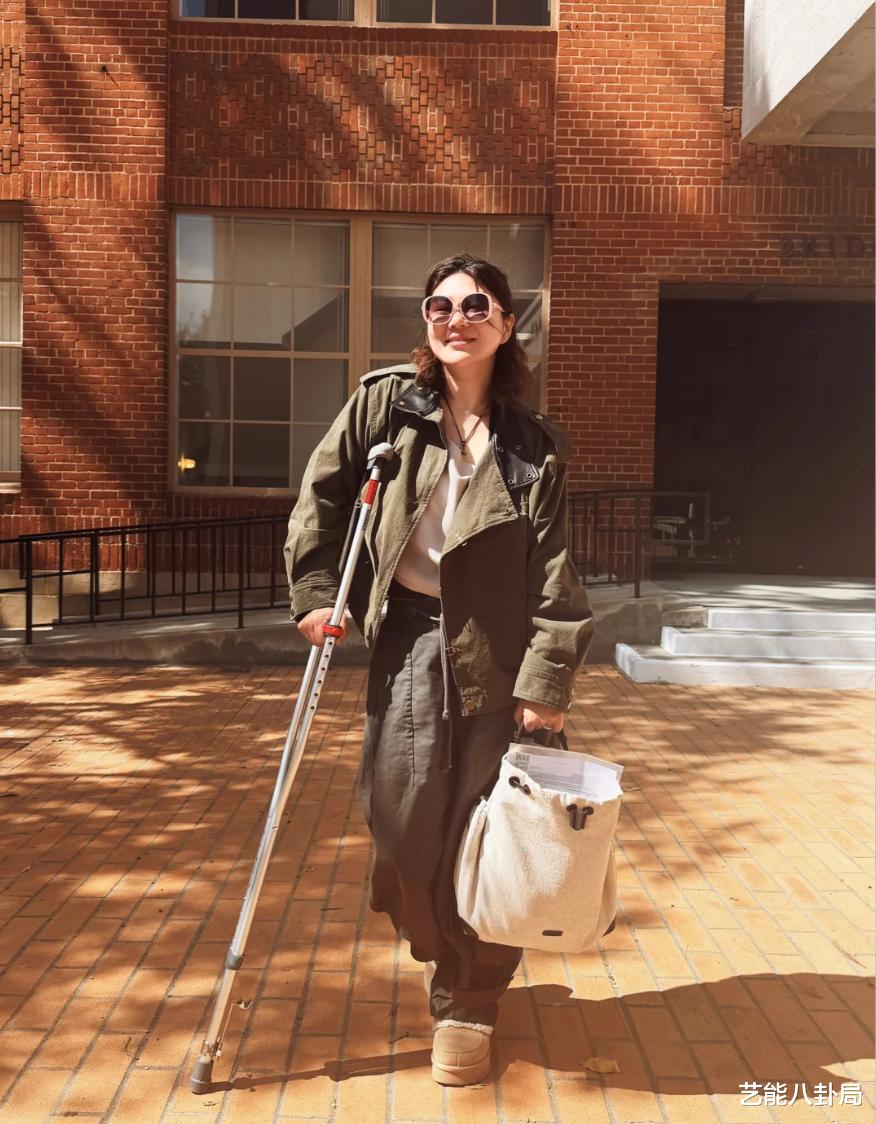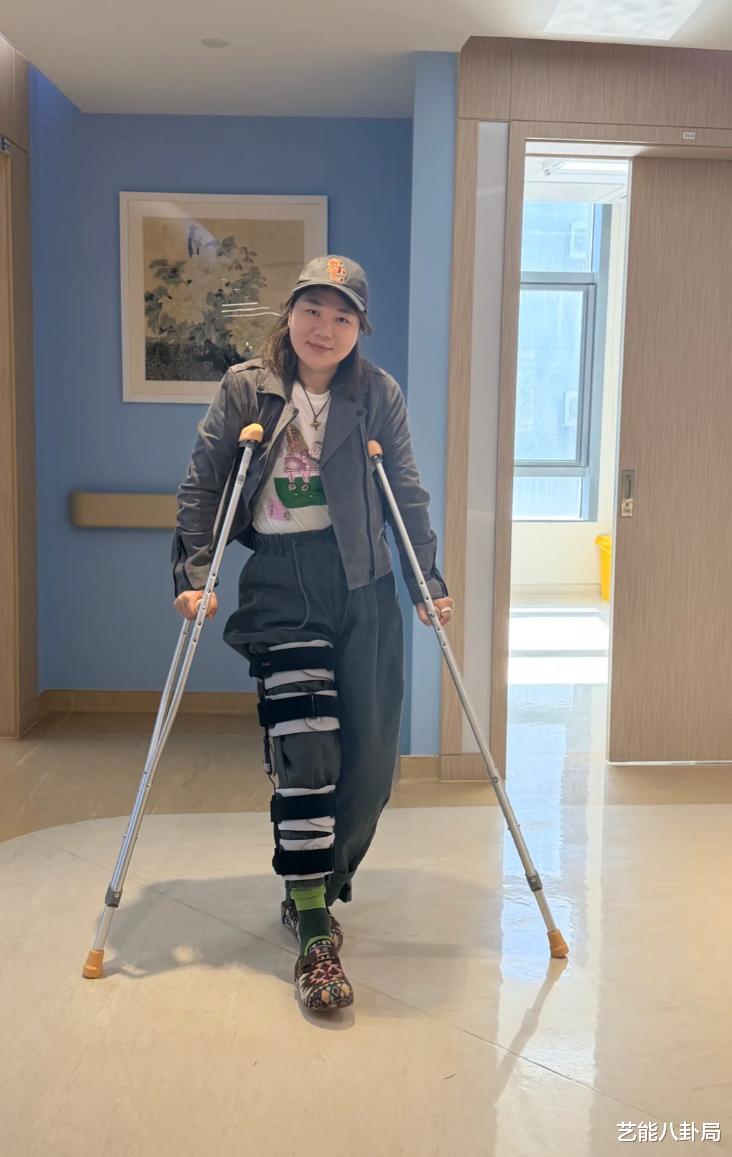 照片中,她拄着双拐,腿裹得严严实实,神情略显憔悴,但回国后总算得到了应有的护理。