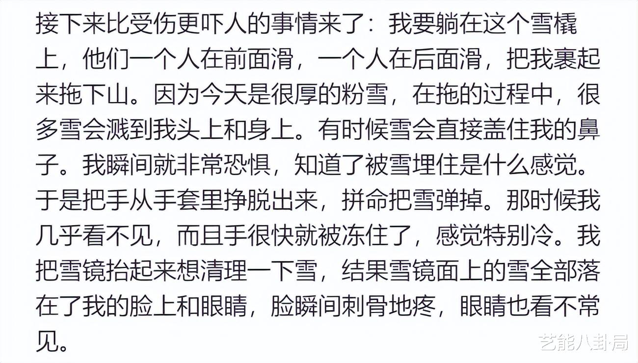 情急之下,杨天真向滑雪场救援人员求助,可对方简单检查后,竟然判定她伤得“不严重”,只把她裹在雪橇上,一路拖拽下山。
