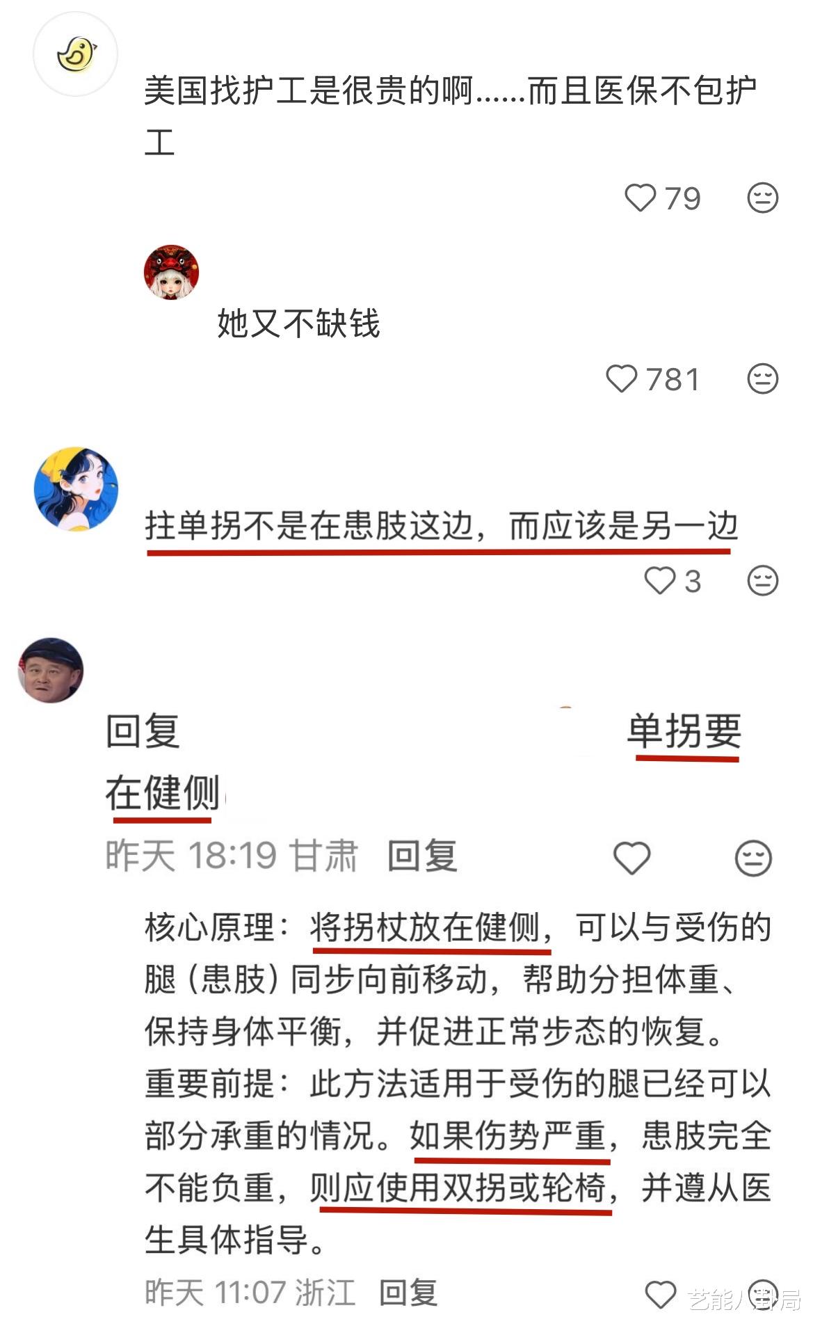 网友无奈指出,“拄单拐不是在患肢这边,而应该是另一边!”