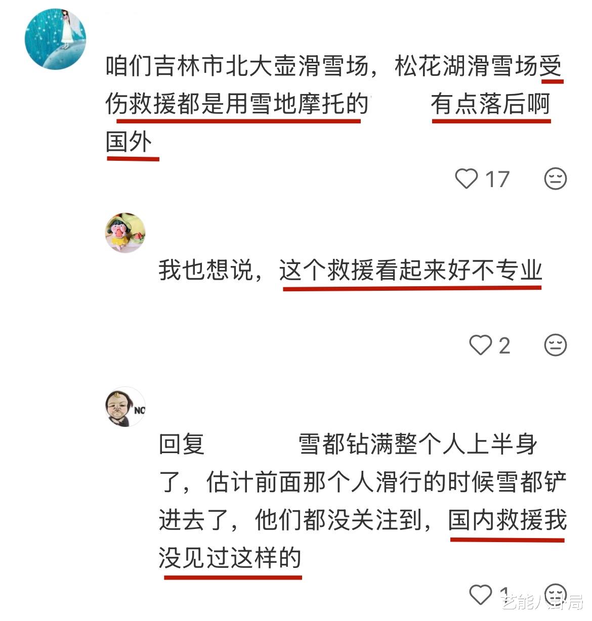 评论区清一色都是质疑和提醒,有网友一眼看出不对劲,直言当地的现场救援太不靠谱,“国内松花湖滑雪场受伤救援都是用雪地摩托的,有点落后啊国外!”“这个救援看起来好不专业。”