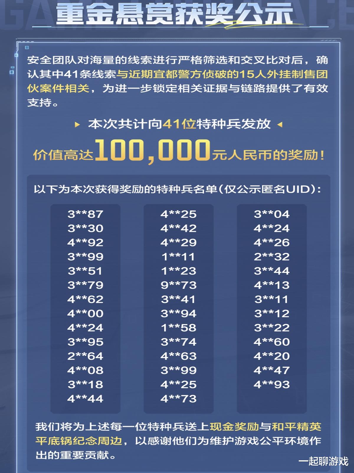 但是想要“根除”科技力量,不是想象中那么简单的事情,巡查、猎鹰实时等系统的助力,也让玩家们为公平竞技的环境出了一份力,如今光子更是发出“悬赏令”,拿出10万奖励发给41位玩家,大快人心!