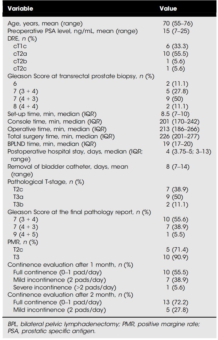 Versius机器人手术系统则是较新进入市场的系统,它以轻量化、模块化设计为特点,提供了更灵活的手术布局选项。根据发表在BJU Int杂志的一篇题为“Versius Robotic Surgical System: Case Series of 18 Robot-Assisted Radical Prostatectomies”的研究,Versius系统在实际应用中表现出了良好的手术效果和安全性,手术中位设置时间为8.5分钟,中位控制台时间为201分钟(表1),且无相关并发症或需要转换手术方式的情况[2]。