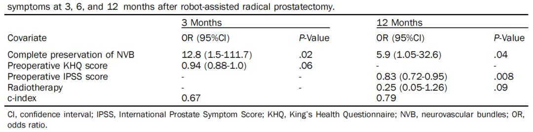 此外,根据Urology杂志的一项研究,我们可以看到一些关于术后生活质量的重要数据。该研究发现,尽管机器人辅助前列腺癌根治术后存在尿失禁问题,但具有较多前列腺的患者会在一年内经历下尿路症状的减少,这进一步提升了他们的生活质量。具体来说,中度至重度尿路症状的患者在手术前占比48%,术后3个月、6个月和12个月分别降至40%、34%和23%。此外,术后6个月时,患者达到与术前相同的满意度水平。研究还指出,神经血管束保护是术后早期尿路症状恢复和性功能改善的唯一预测因素,在术后3个月时,神经血管束保护是患者感到舒适的唯一预测因素(OR=12.8,95%CI:1.47~111.7,P =0.02,表2),并且与术后IIEF-5(国际勃起功能指数)的中位数提高有关[3]。