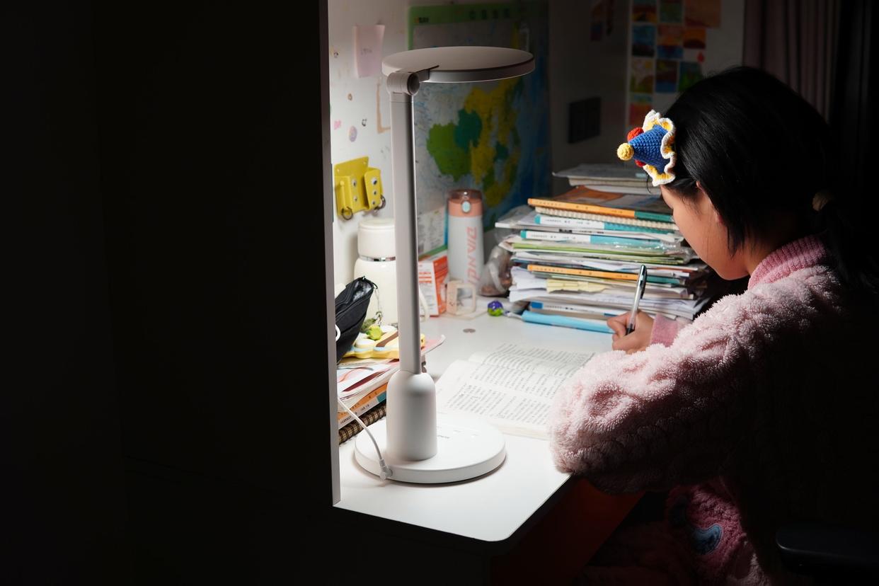 ▲外甥女在桌前写作业时,整块桌面都可以被完整、均匀地照亮。即便有必要调整看书范围时,也不用担心新区域光强会变弱。
