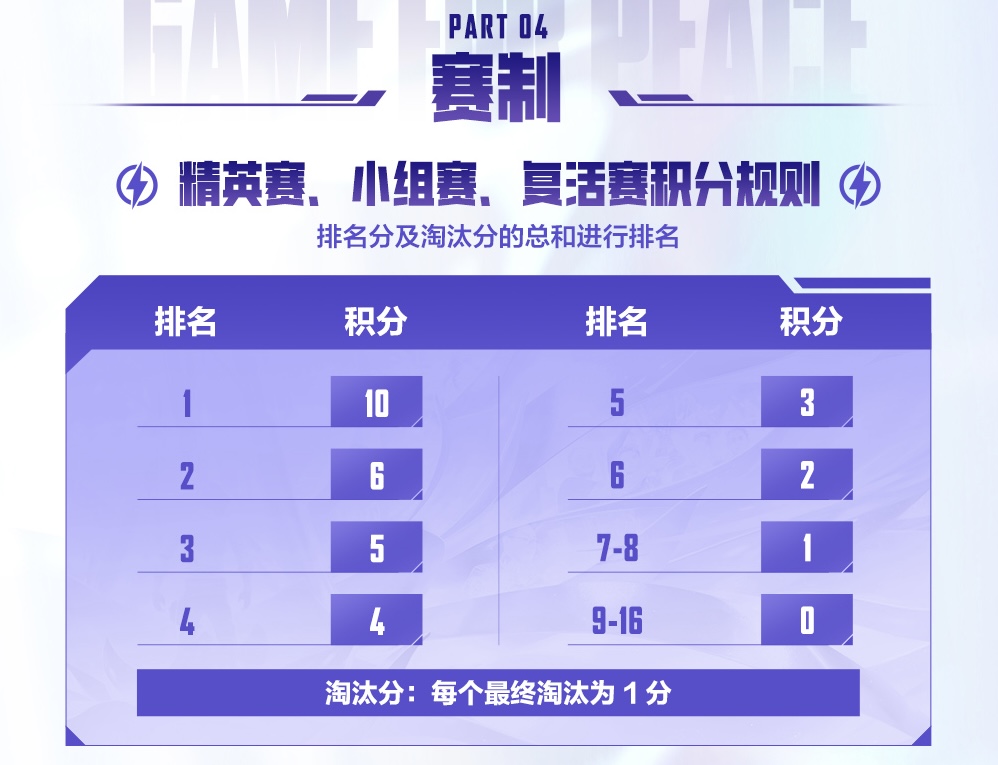 在精英赛、小组赛、复活赛阶段均以淘汰分及排名分的总和进行排名,每个最终淘汰累计1分淘汰分,而成功拿下当局胜利将获得10分排名分。这势必将促使所有战队在积极主动拿下淘汰的同时注意运营,以谋求获得更高排名,让比赛的观赏性和不确定性达到极致。