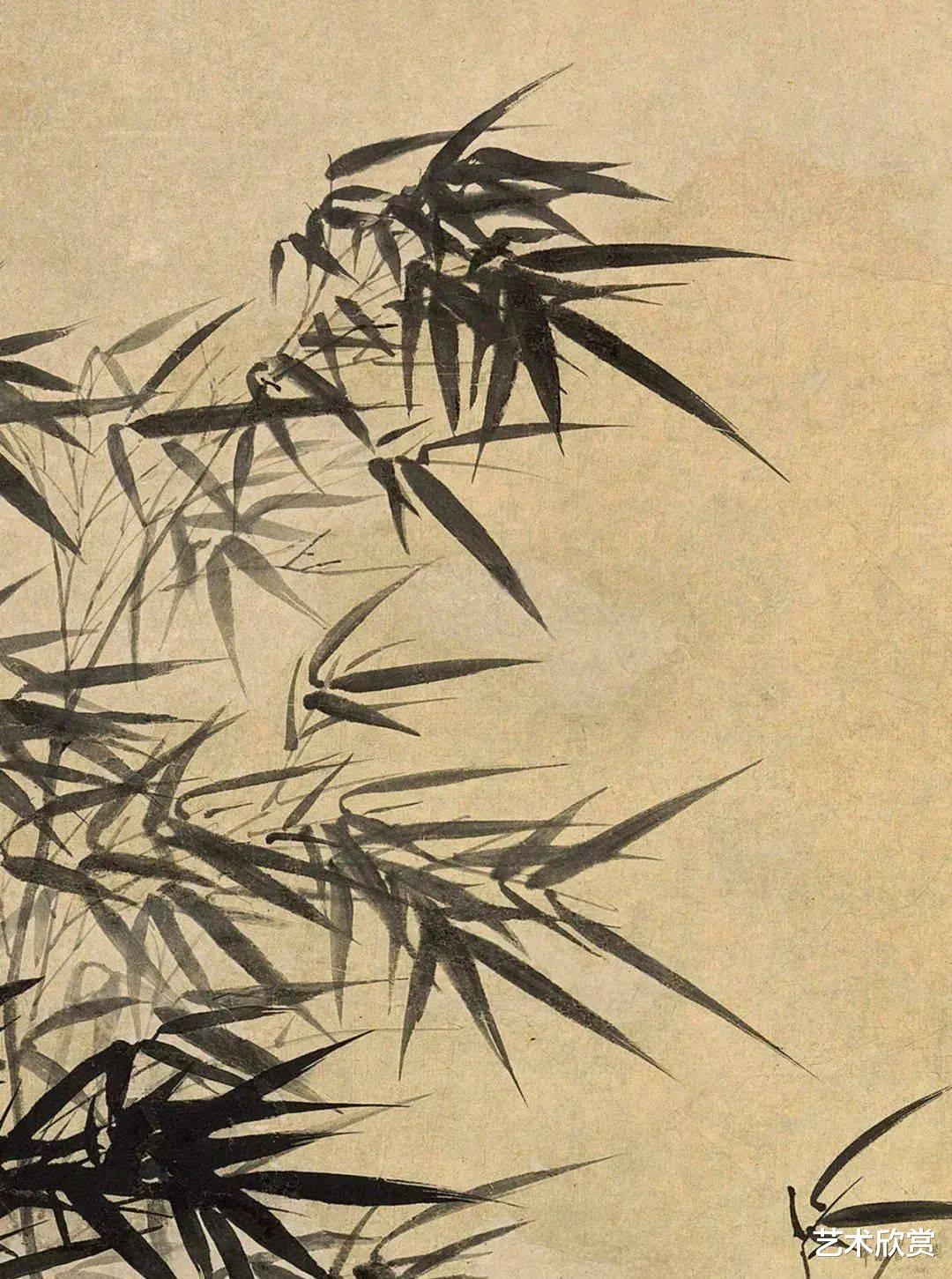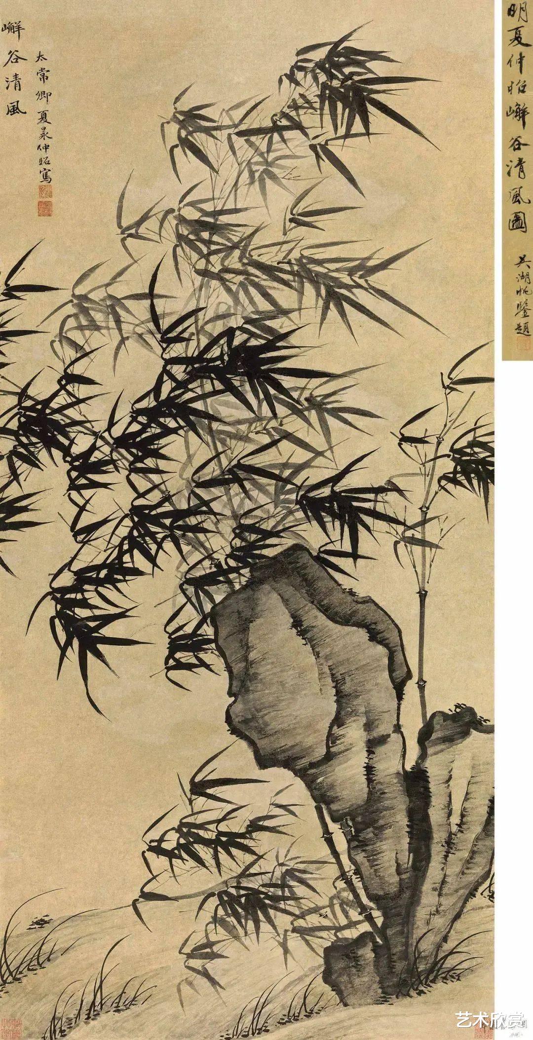 夏昶的《嶰谷清风图》堪称明代墨竹艺术的巅峰之作。画面中竹枝似被疾风骤雨裹挟,却无一丝凌乱之态——主竿以中锋立骨,笔力如铁线银钩;侧枝穿插如剑锋出鞘,枝叶翻卷处墨色枯润交叠,既有“飞白”的苍劲,又有“涨墨”的氤氲。
