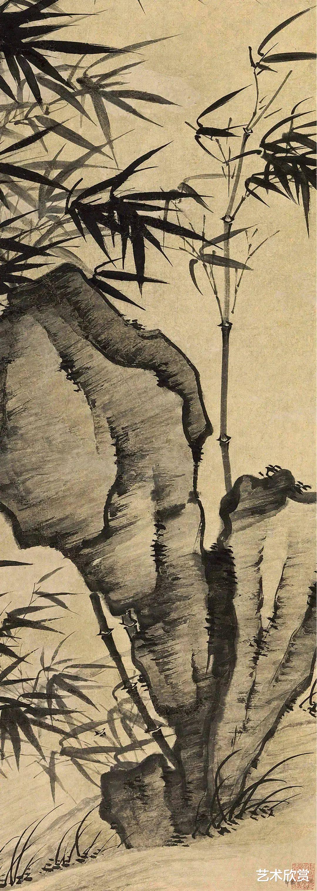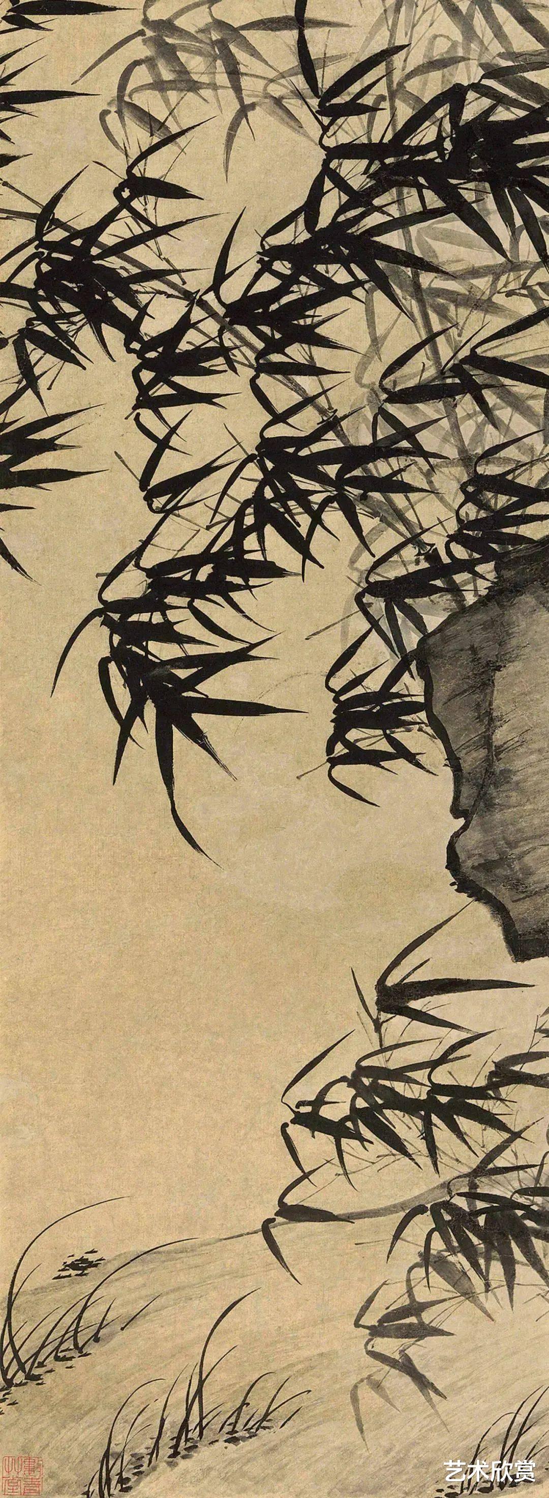 夏昶深谙“写竹即写人”之道,竹节的顿挫暗合文人风骨,叶片的聚散则似君子之交的疏密有度。 尤为精妙的是画中虚实对比:拳石以刮铁皴法勾勒,墨色浓重如铸铁凝霜,与竹枝的灵动形成刚柔相济的张力;土坡以淡墨轻扫,似有若无的笔触将观者视线引向虚空,仿佛能听见竹叶摩挲的飒飒风声。