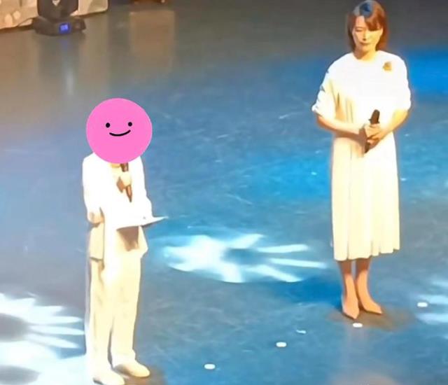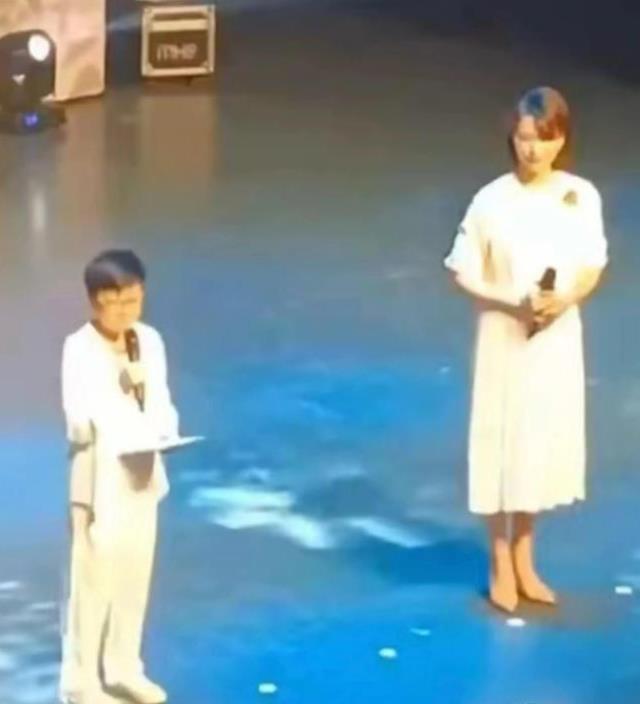 而儿子也是身穿一件白色的西装,戴着眼镜,拿着文稿在朗诵,看起来非常落落大方。