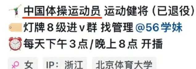 她是这样介绍自己的,主打就是一个光鲜亮丽的人设,她是一名“中国体操运动员”。
