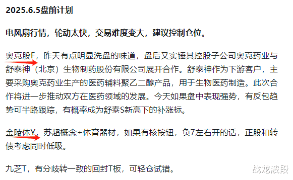昨天是整体修复的一天,但还是电风扇轮动行情。现在是当天板块高潮次日都比较坑人,不过这波在舒泰S过百后,明显20cm的赚钱效应要更强一些,另外也是因为近期10cm总莫名其妙进监管,太打击信心了。这周到目前盘前计划里面分享的几个票,就一个德邦股F暂时亏损,(准确说了买点,临盘竞价明显不符合,不过自己还是去了,虽然目前亏损,但今天还有反包预期),其他都是超级大肉。周三盘前分享的均瑶健K,联化科J,金陵体Y,锦鸿集T,今天都给了板砸的机会。周三收盘后还有人说,你这分享的几个票不行啊,就这水平你还分享什么票???我真的凭良心了,思路切换看好的从来也不藏着掖着,我分享有得过你们任何人的好处还是???我的马前胜率已经对的起在座的任何铁子了,这样的博主,现在你还能找出几个。这种垃圾行情,谁都不可能一直都对的!就昨天盘前分享的奥克股F加金陵体Y今天也双双20cm。今天还有人私下我问舒泰S还留吗?他就满仓了这一个,可以卖了梭哈金陵股F吗?我真没法回答,听你说你满仓干我都有点慌啊,不过昨天朋友圈我也说了,水上8个点左右,我都走了。因为开盘,之前断板的华森制Y,以及昨天断板的海南海Y,还有昨天晋级的万邦D,九芝T,都开的不及预期,而且舒泰S拉的时候,板块并没有联动,所以从盘面来看医药是不及预期的,只好先走为妙,不过尾盘来看,医药还是有先手继续拿筹码的,明天还是有修复预期,不过后续还是关注舒泰S就好了。自己今天开盘就低吸了均瑶健K以及锦鸿集T,虽然午后都开始炸板,但也妥妥的吃到肉了。金陵体Y就算你和我一样畏高,但转债套利还是可以轻仓搞一下吧。