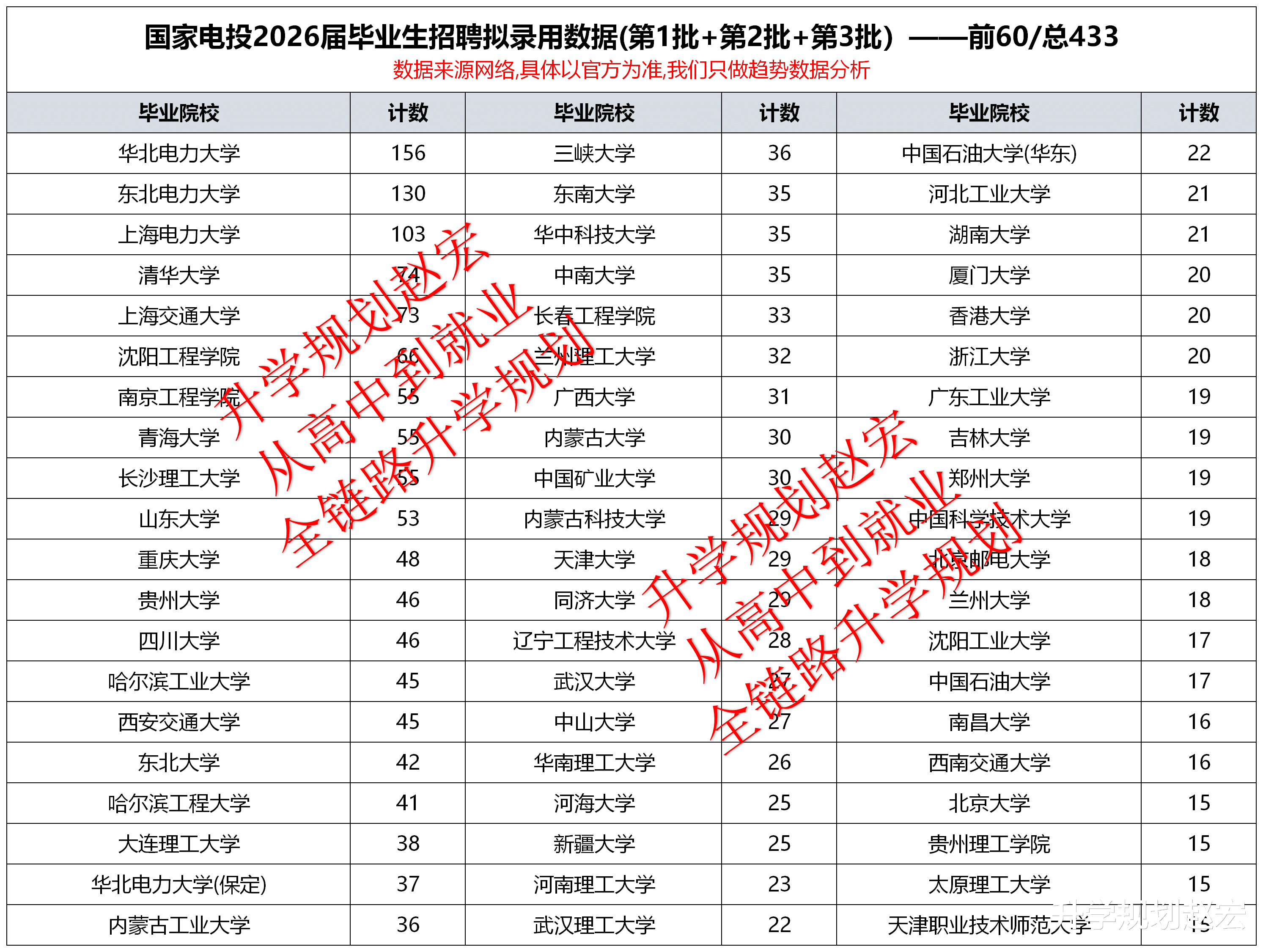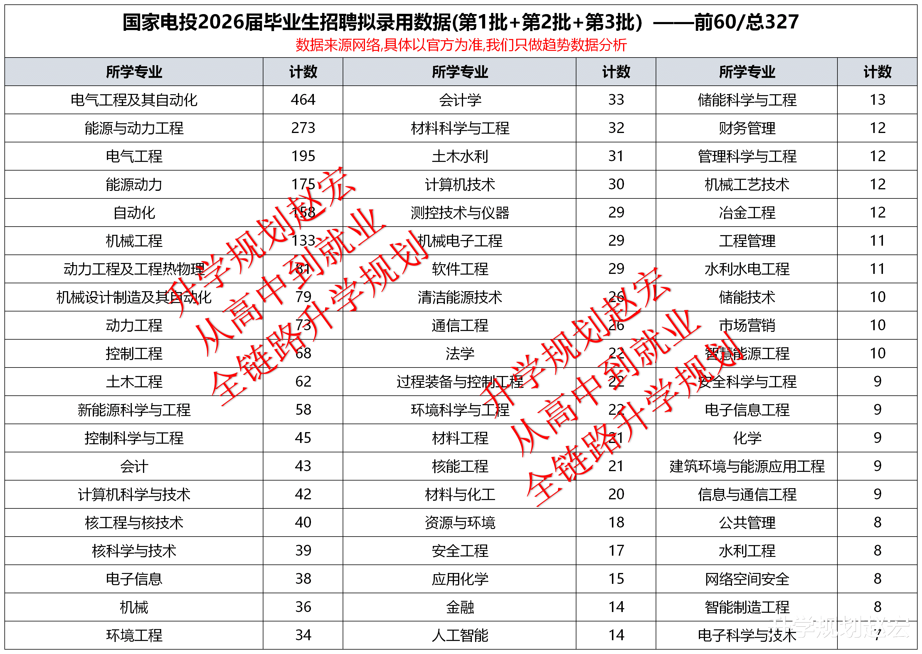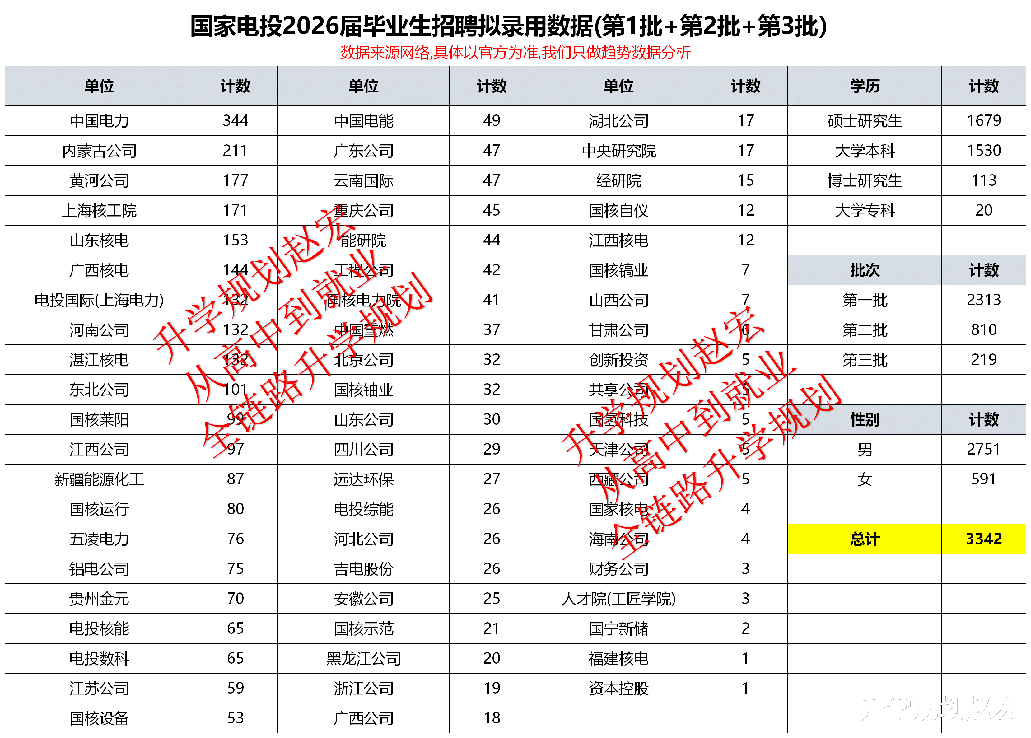 本文咱们再来看看电网外的五大四小之一的国家电投,2026年前3批录用3342人,人数整体也差不多了,后续还有部分名单。但是想要的数据基本上也差不多了。