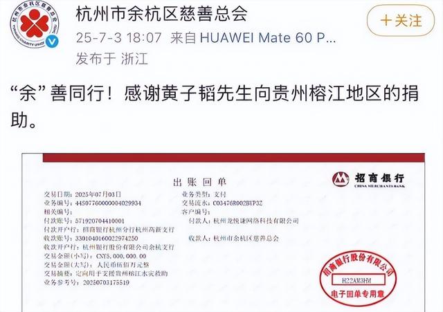 钱是通过他的杭州公司,直接打到了杭州市余杭区慈善总会账上去的。而且他还明确备注,这500万,就是捐给贵州榕江的。