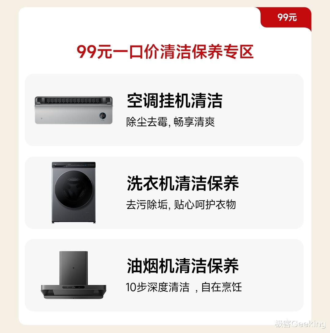大家电一口价 99 元清洁保养还有面向大家电产品的服务活动,包括空调、洗衣机和油烟机的清洁保养,不限制型号,购买有效期均为一年,拥有 30 天保障期,都是上门服务方式,服务价格如下: