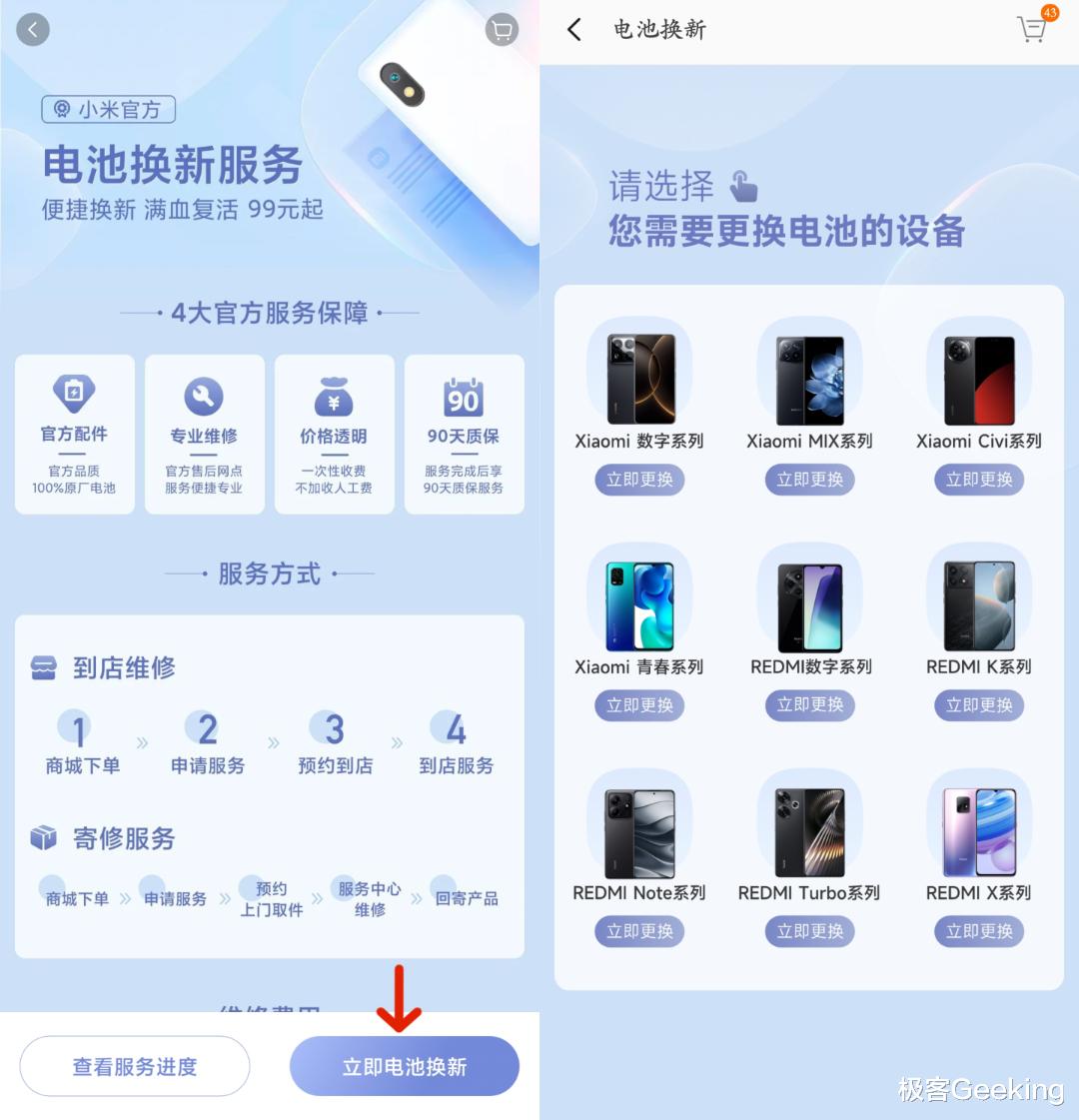 再点击「立即电池换新」,选择产品系列和自己的手机型号。