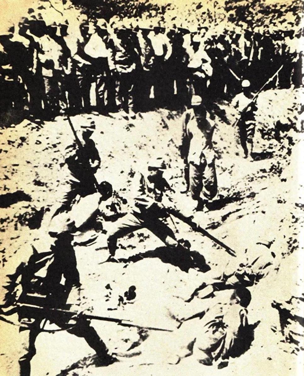在一幅广为流传的历史照片中,人们看到了他:头戴军帽,身穿白衬衫,正举刀砍向跪在地上的中国青年。