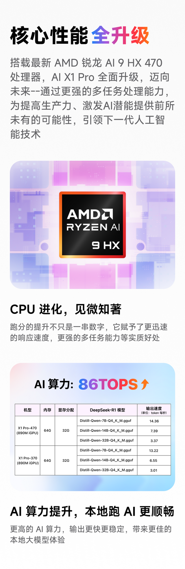相比上一代的铭凡X1 Pro-370,AI X1 Pro-470的核心变化集中在AI算力与多任务处理能力。锐龙AI 9 HX 470的NPU本地AI算力提升至86 TOPS,为本地部署大模型、AI 图像生成、语音识别等应用提供了更充足的算力支持,相较需要依赖云端的方案,本地AI不仅响应更快,也在隐私与稳定性上更具优势。