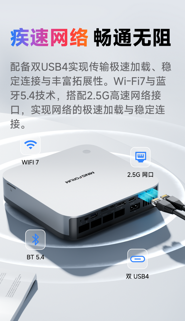 网络与交互方面,AI X1 Pro-470同样全面升级至Wi-Fi 7、蓝牙5.4,并配备双2.5GbE有线网口,为本地AI服务、私有存储与网络应用提供稳定高速的连接支持。同时,设备内置指纹识别、降噪麦克风与双扬声器,提升日常登录、会议与人机交互体验,减少外设依赖。