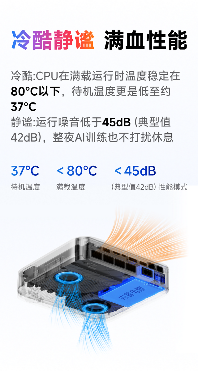 对于Mini PC主机来说,很多消费者都很在意整机的散热,但AI X1 Pro-470在散热与供电设计上,采用相变材料(PCM)+双铜热管+主动散热方案,在高负载运行下CPU温度稳定控制在80°C以下,运行噪音低于45dB。同时,135W电源内置,并支持USB4一线通设计,进一步简化桌面布线。