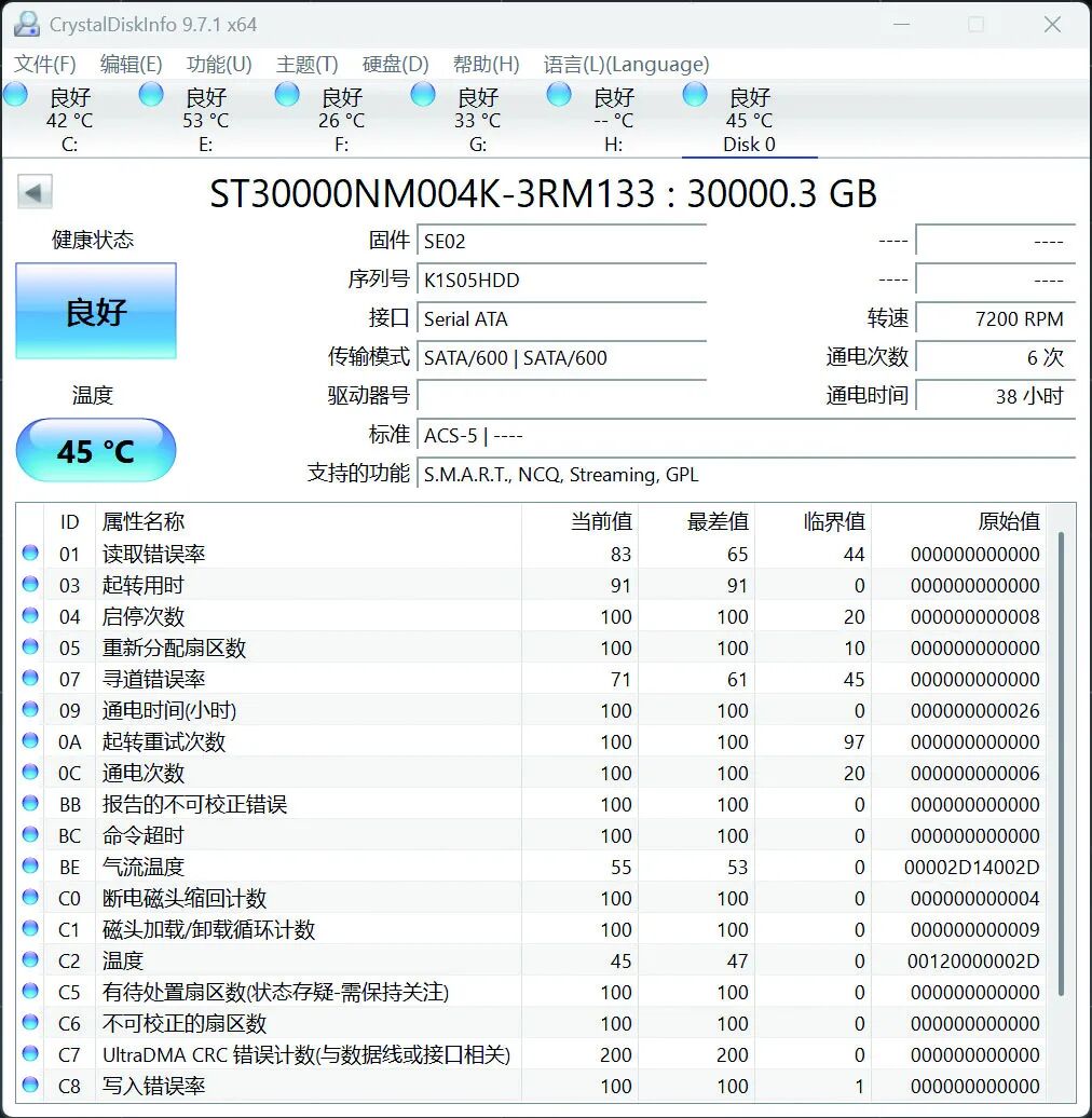 ▲连续写入半小时后,在CrystalDiskinfo软件中侦测希捷银河Exos M 30TB硬盘的温度。