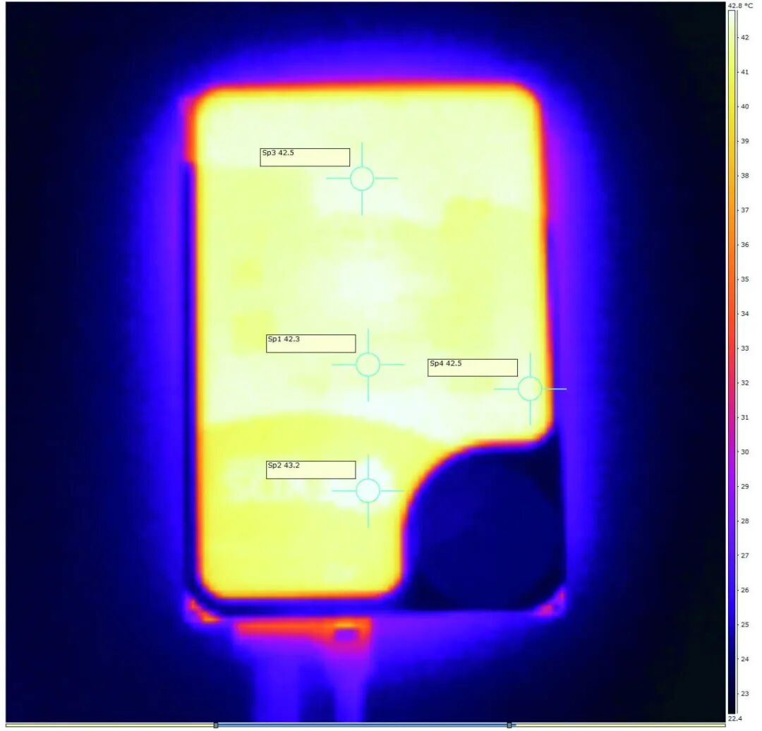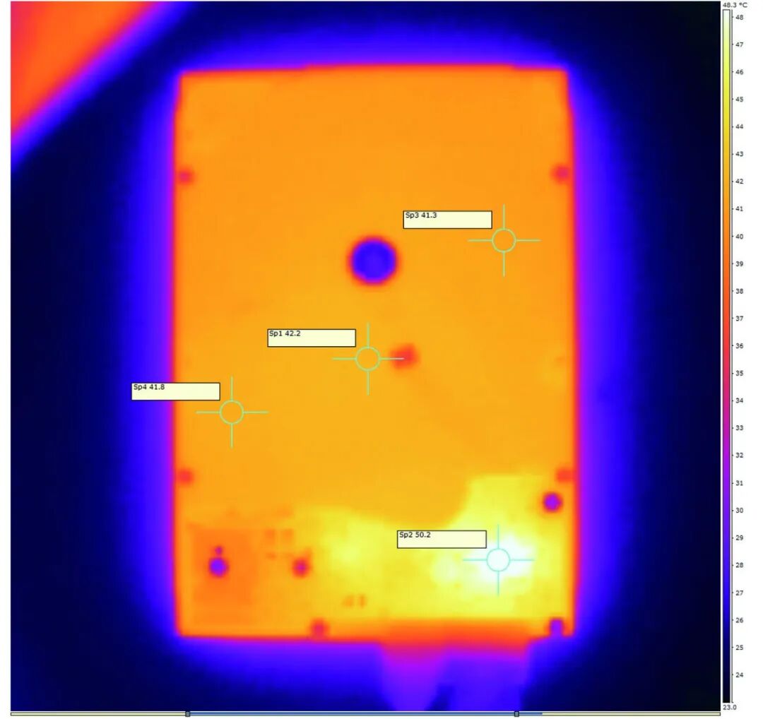 ▲希捷银河Exos M 30TB硬盘在连续写入半小时后的背面热成像图