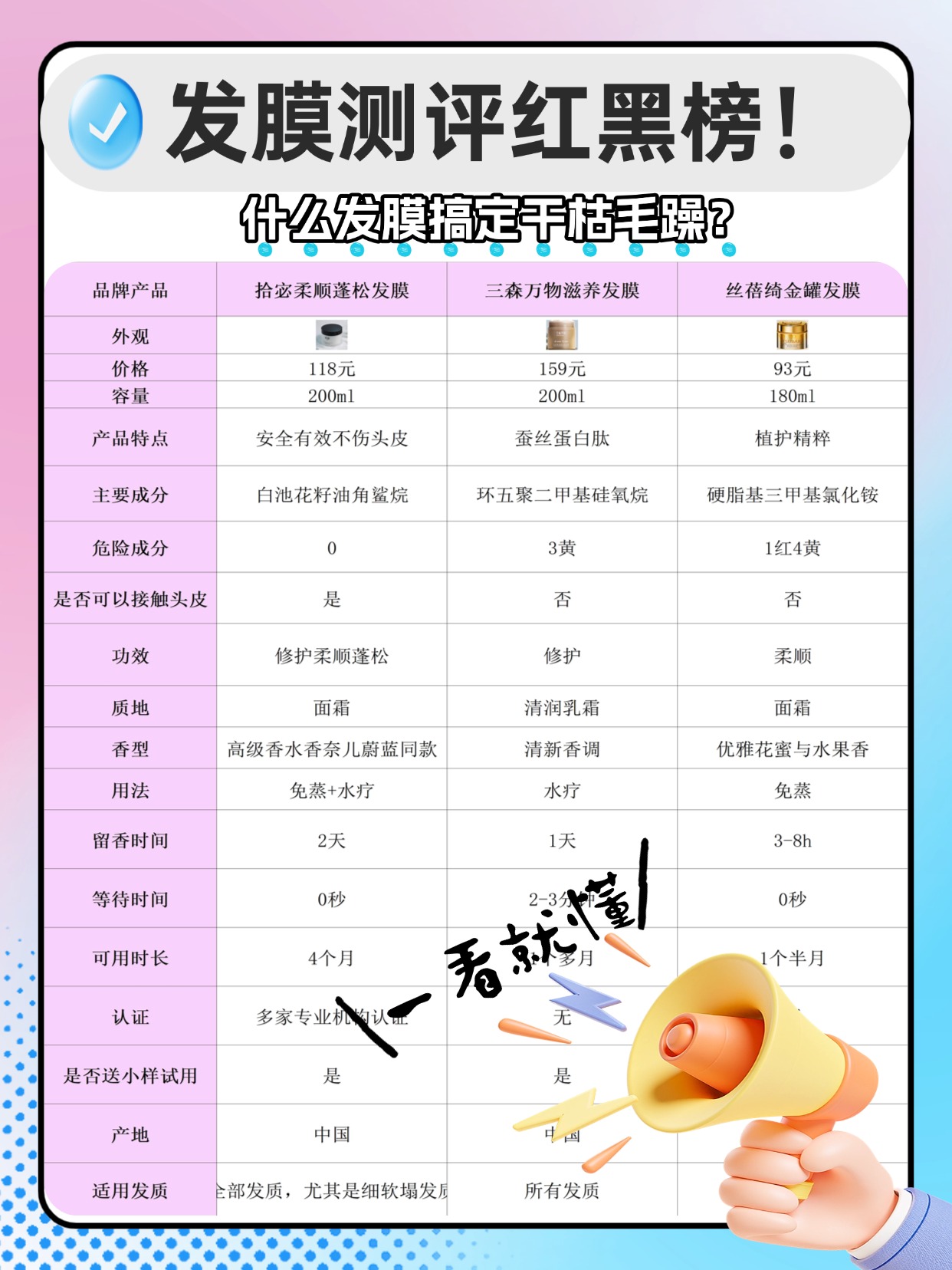 大家肯定想知道发膜哪些成分安全好用?针对干枯毛躁的头发,植物精油、泛醇、海藻糖、甘油这些保湿修护成分都很安全,还有水解蛋白、角蛋白能补充发丝营养,修护受损毛鳞片,这些成分温和又有效,选发膜的时候可以多留意配料表。还有发膜过期了还能用吗?绝对不能用,过期的发膜成分会变质,不仅失去修护干枯毛躁的效果,还可能滋生细菌,用在头发上会刺激头皮,导致头皮发痒、泛红,甚至让头发变得更差,哪怕只过期几天也别心疼,直接扔了就好。选发膜看成分是关键,还要注意保质期,这两点直接决定修护干枯毛躁的效果,接下来我就分享搞定干枯毛躁发膜的选购实战经验,全是踩坑后的真实总结。