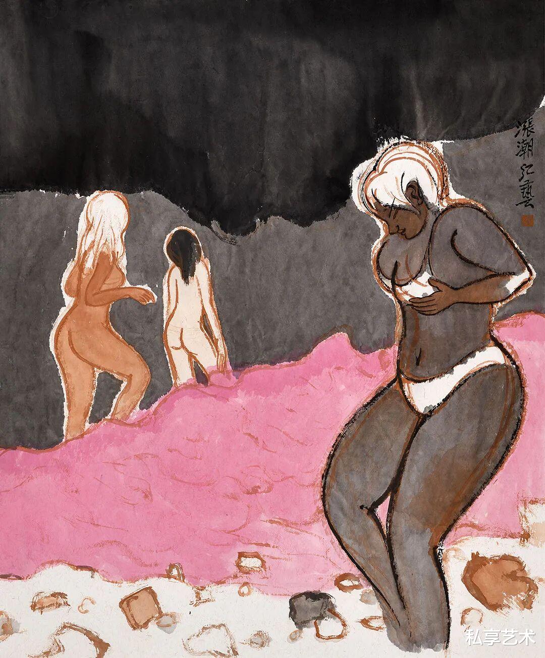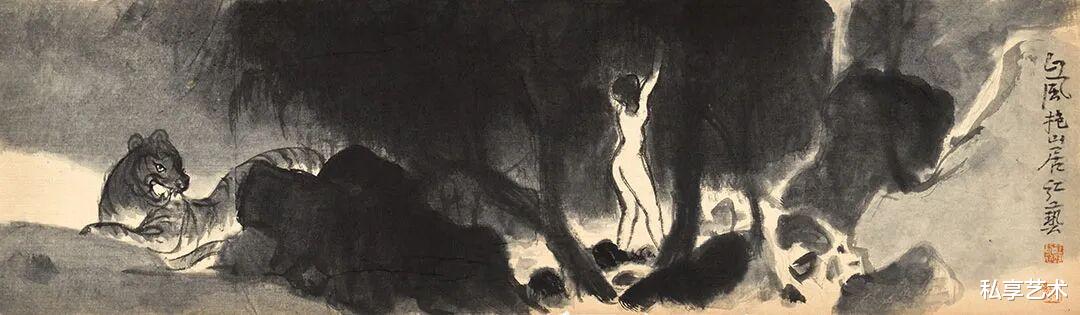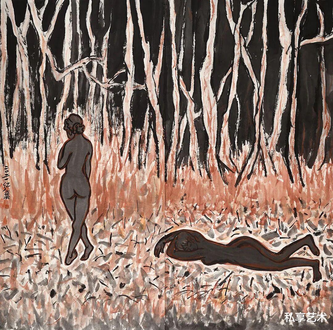 《山风》一作,为表现深林之幽,树、木、土、石以浓重清淡之墨来洇染,线条隐于墨色,几乎不着笔痕,期间河溪清亮,少量留白,恰好与凝脂的女体形成呼应与对比。更有意味的是,一只猛虎伏于石侧,虽身姿凶猛,但气质驯服,其粗粝之笔触及阳刚之气象,与婀娜娇媚的女人体形成视觉上的对比和气韵上的呼应。与徐悲鸿、黄永玉、范曾、戴敦邦等人的同题材绘画相较,更能在古意中摆脱对传统叙事的依赖,而是更加注重视觉语言的形式探索。