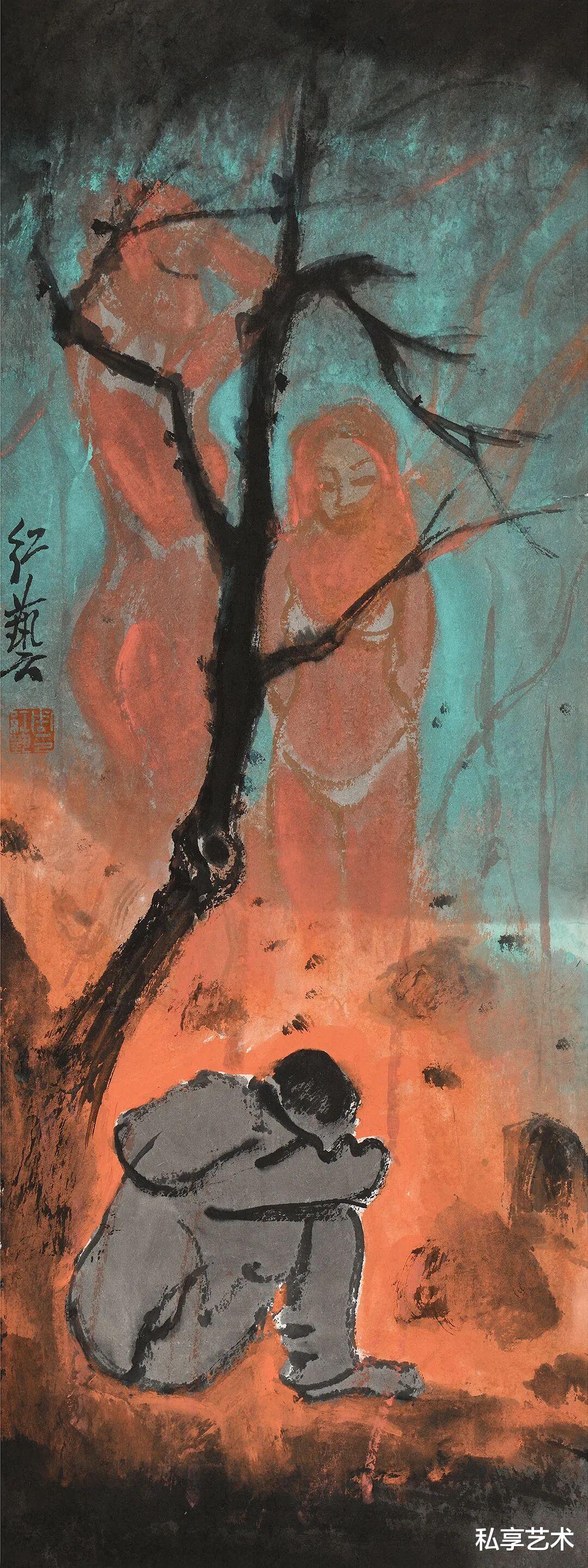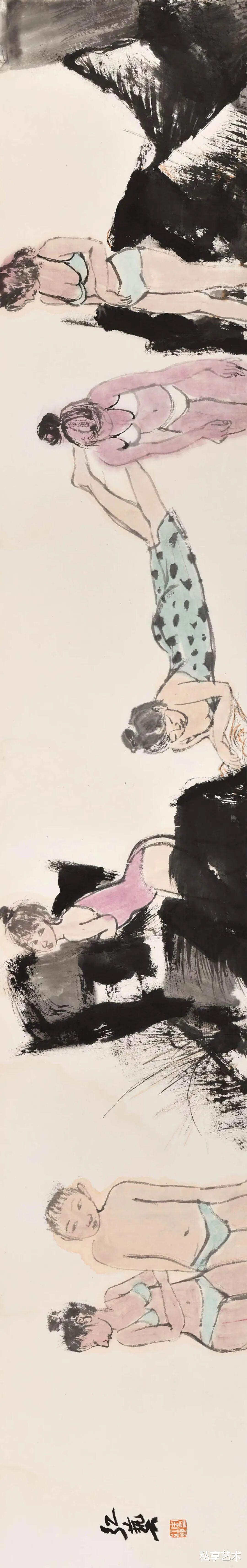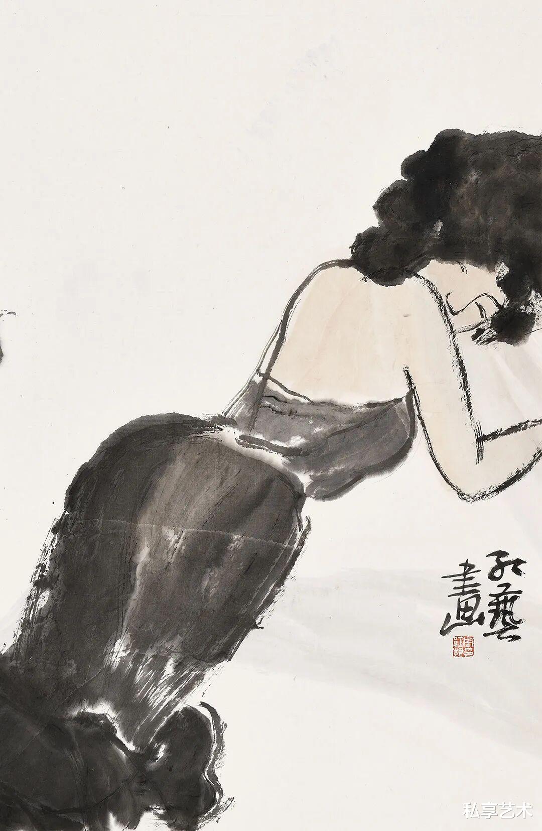 《山风》一作,为表现深林之幽,树、木、土、石以浓重清淡之墨来洇染,线条隐于墨色,几乎不着笔痕,期间河溪清亮,少量留白,恰好与凝脂的女体形成呼应与对比。更有意味的是,一只猛虎伏于石侧,虽身姿凶猛,但气质驯服,其粗粝之笔触及阳刚之气象,与婀娜娇媚的女人体形成视觉上的对比和气韵上的呼应。与徐悲鸿、黄永玉、范曾、戴敦邦等人的同题材绘画相较,更能在古意中摆脱对传统叙事的依赖,而是更加注重视觉语言的形式探索。
