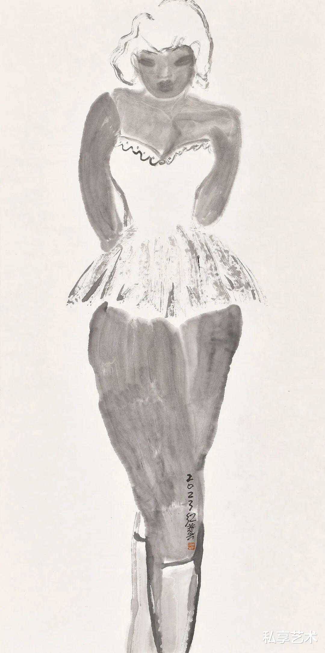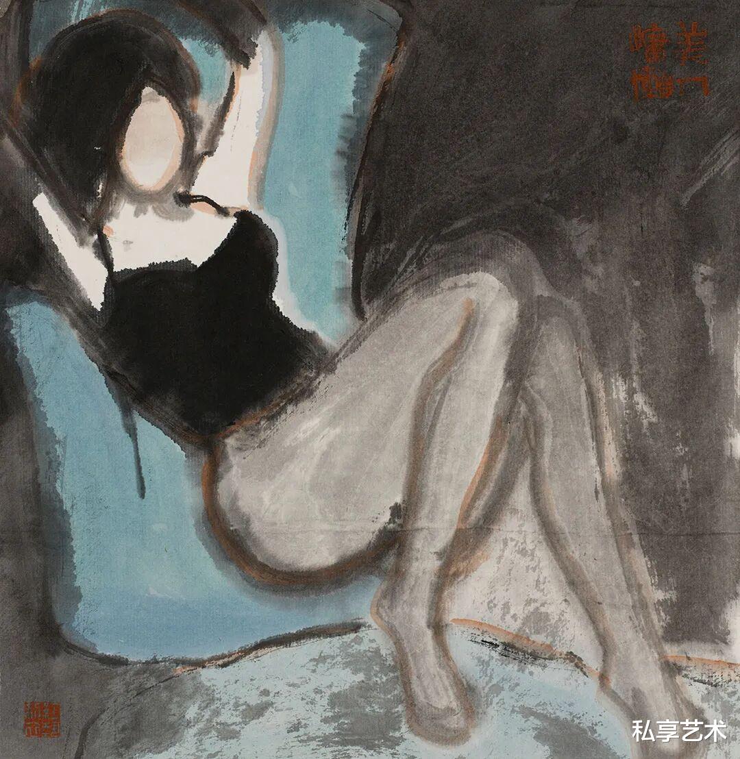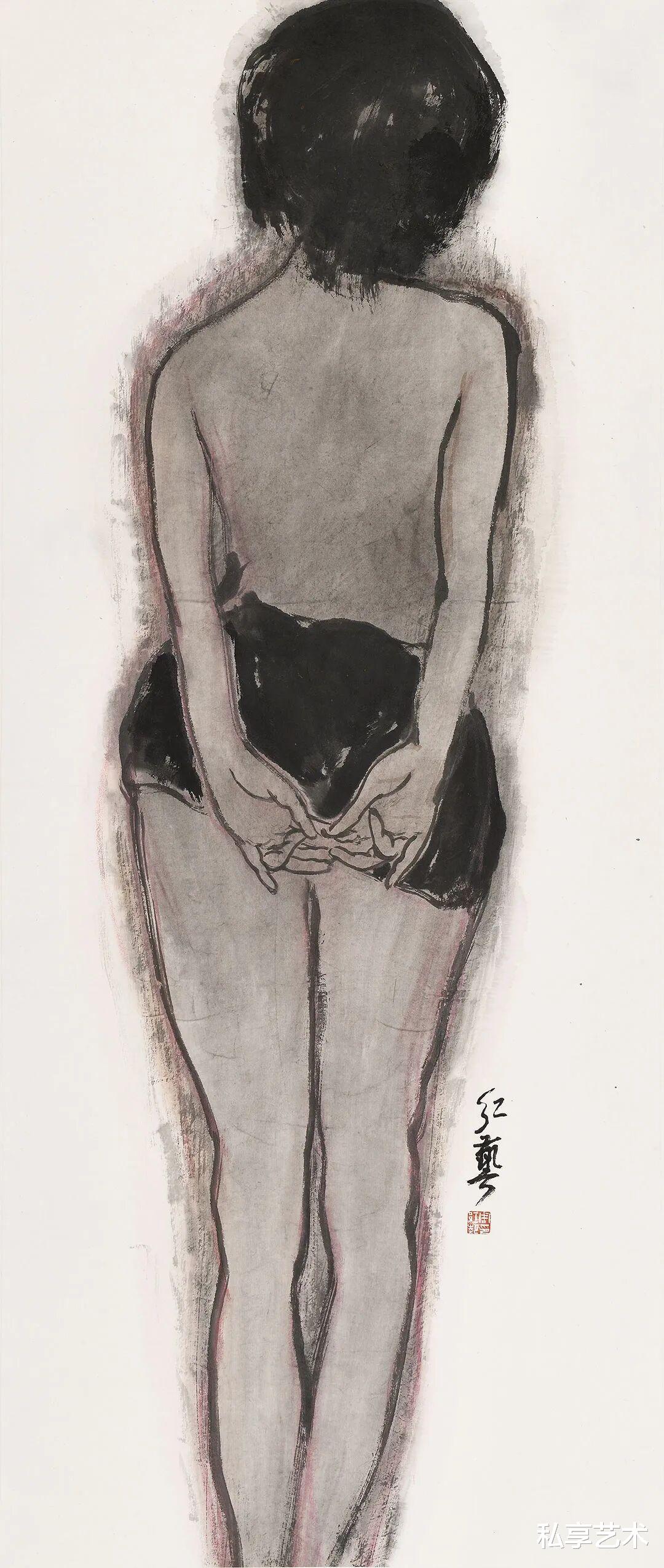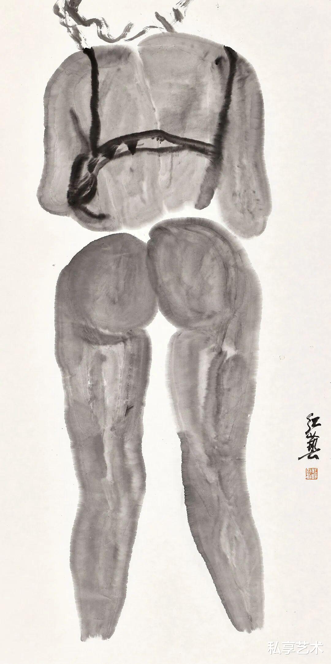 在《水墨人物系列》中,他以带有生拙之感的粗放笔触,水墨相冲,借助西方人体解剖之法,塑造出女人胴体的紧致轮廓和生命张力。在突出女人性感身体语言的同时,其实更在探索形体与水墨之间的依存关系。胴体上的笔墨之实与衣饰和秀发的空白和灵动线条形成大开大合的视觉对比和缓冲。