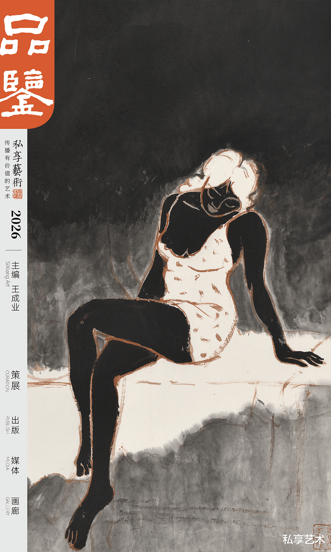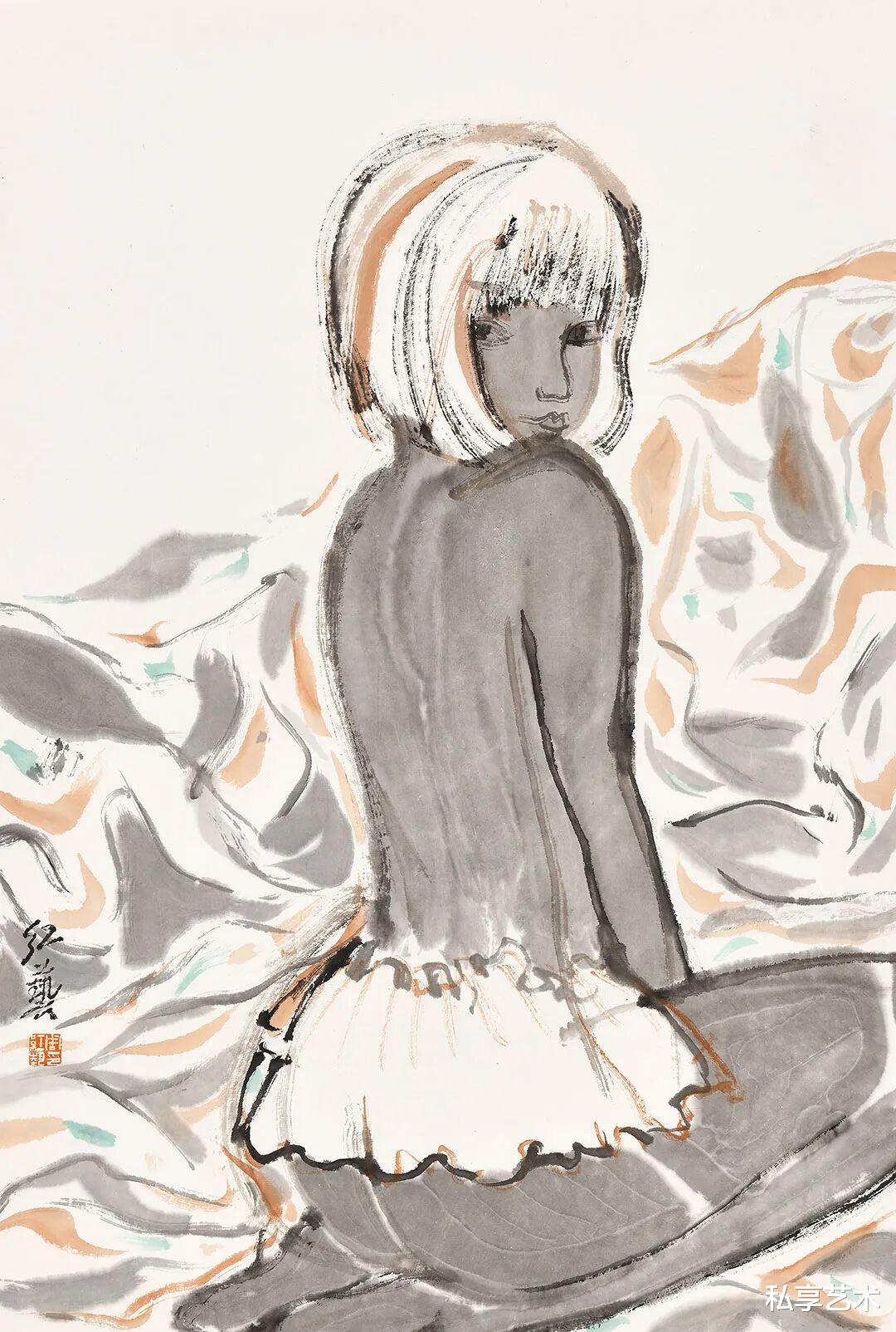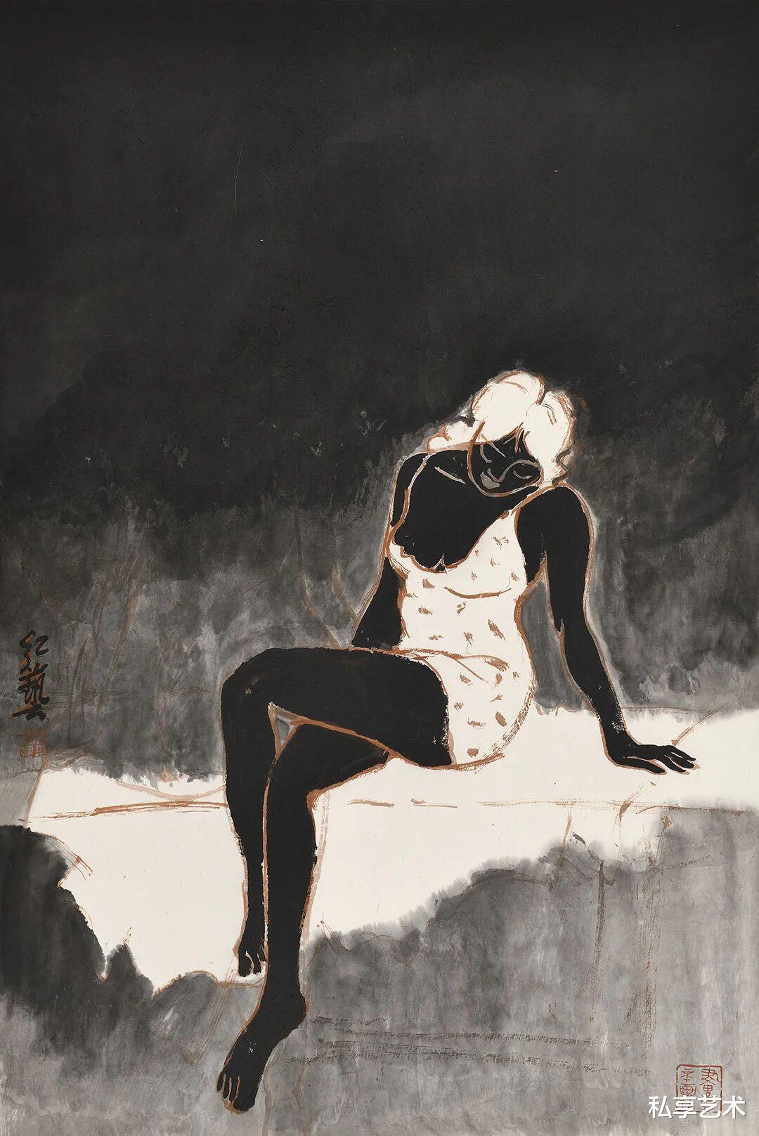 在《水墨人物系列》中,他以带有生拙之感的粗放笔触,水墨相冲,借助西方人体解剖之法,塑造出女人胴体的紧致轮廓和生命张力。在突出女人性感身体语言的同时,其实更在探索形体与水墨之间的依存关系。胴体上的笔墨之实与衣饰和秀发的空白和灵动线条形成大开大合的视觉对比和缓冲。