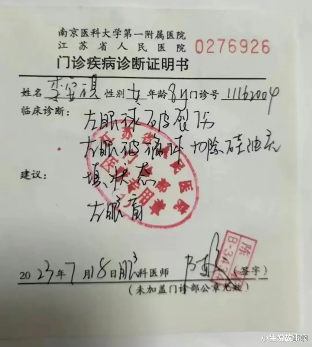 此事后,小安琪被送到江苏省人民医院救治,左眼球不幸破裂,只能切除,导致永久性失明。