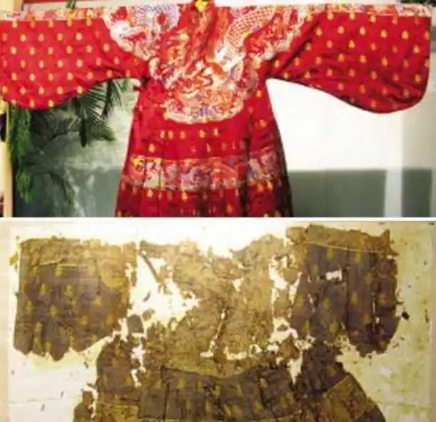 工作人员往上面涂抹塑料溶液想保护,几个月后,华美的龙袍凤衣全部变成黑乎乎的碎片。