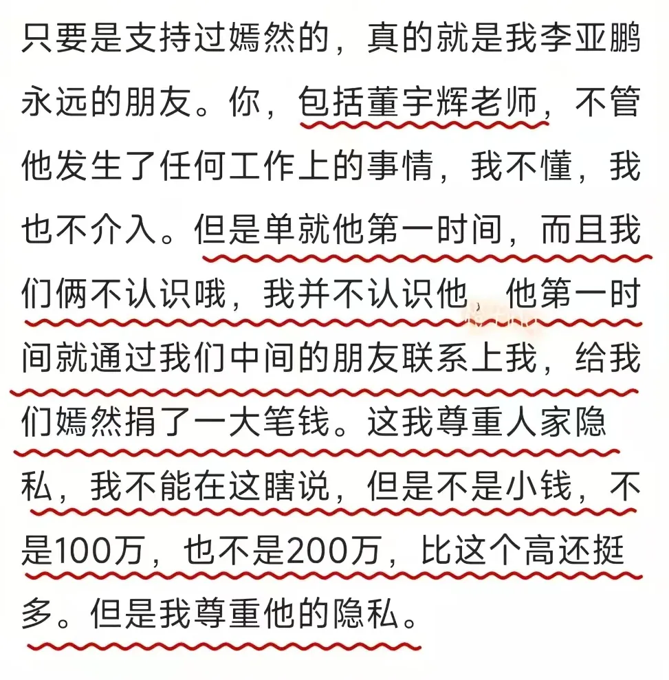 李亚鹏专门提到了董宇辉。他说,两人并不认识,没有夹杂任何的私人情感。但是,在得知嫣然天使儿童医院的境遇后,董宇辉却通过朋友牵线,给嫣然天使儿童医院捐了一大笔钱。