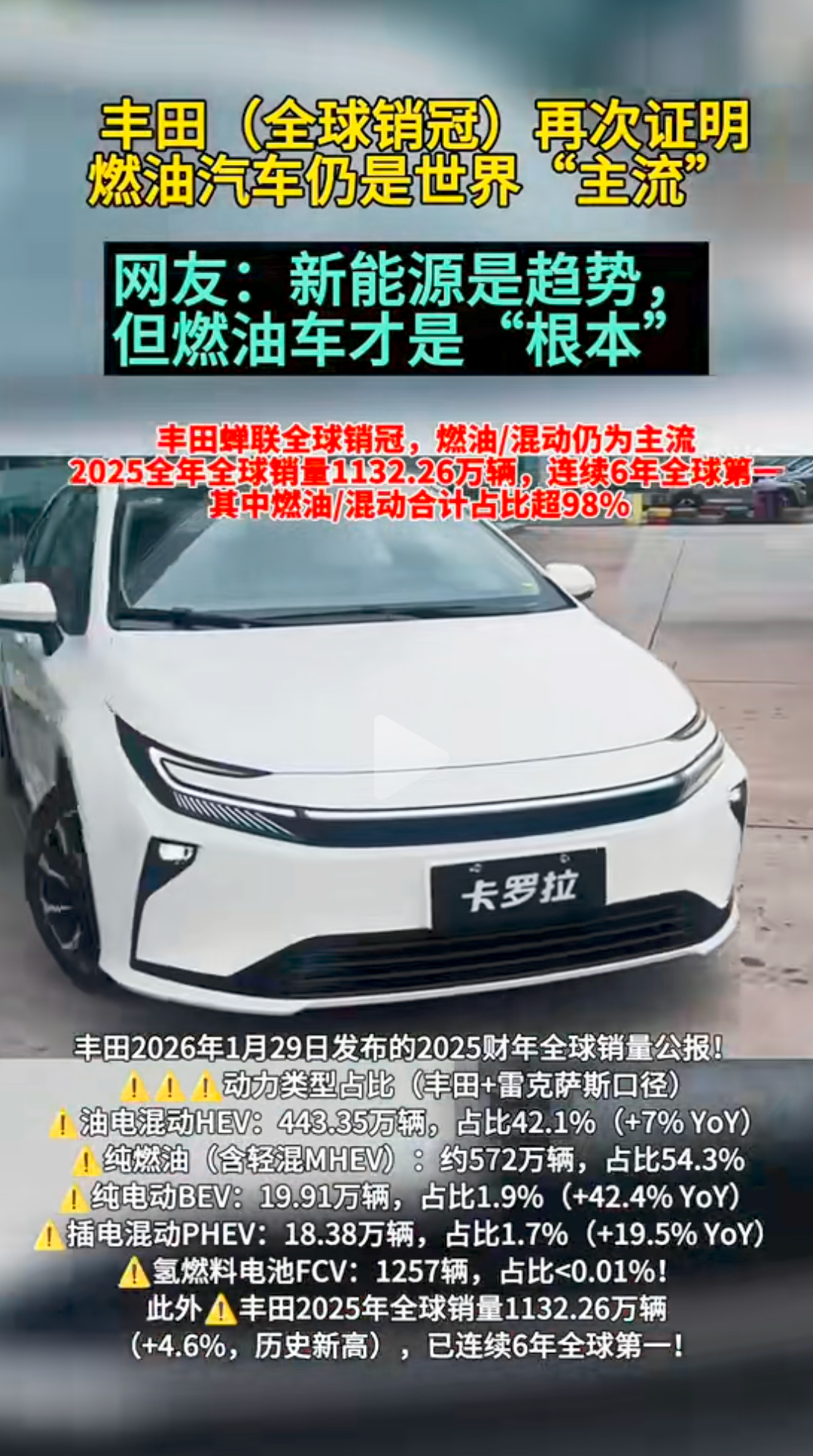 万万没想到吧?2025年全球车企销量冠军还是燃油车的天下——丰田以1132万辆蝉联6年第一,其中燃油及混动车型占比超八成,比第二名大众多卖230万辆。