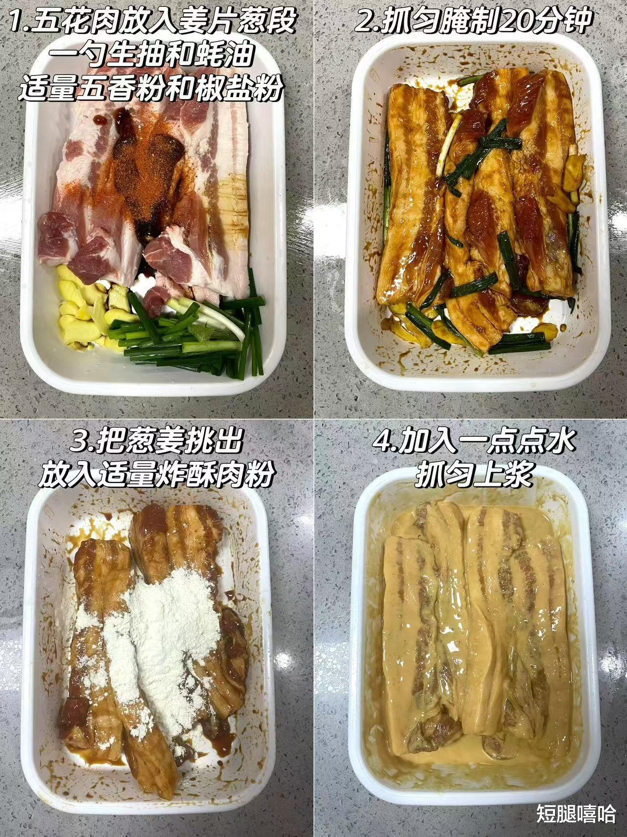 将五花肉放入容器中,加入姜片、葱段、一勺生抽和蚝油,再放入适量的五香粉和椒盐粉,然后抓匀,腌制20分钟。腌制完成后,把葱姜挑出,放入适量炸酥肉粉,继续抓匀,使每块五花肉都均匀地裹上粉。接着,加入一点点水,再次抓匀,让粉浆更均匀地附着在肉上。