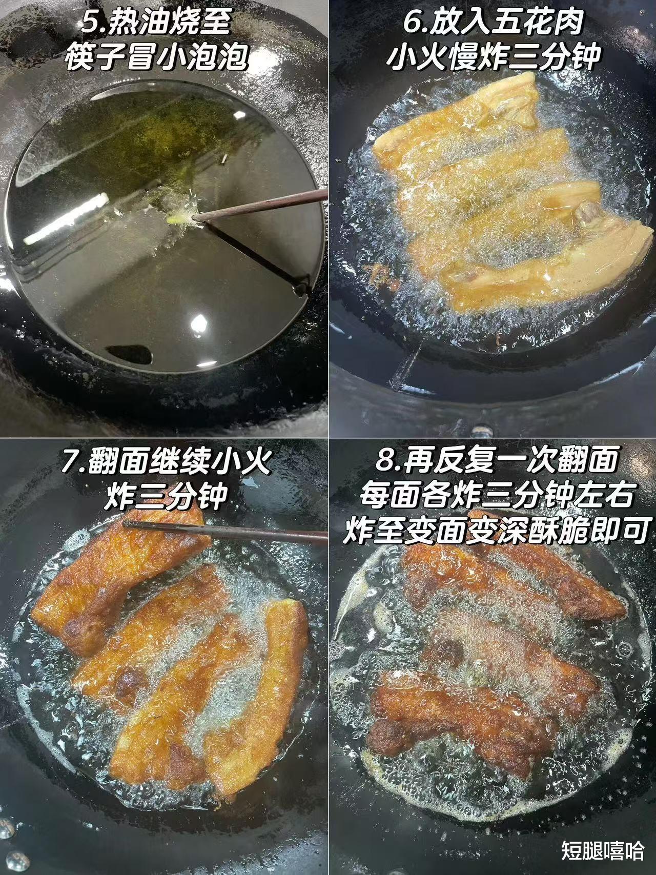 准备好油锅,将热油烧至筷子放入油中冒小泡泡。然后,轻轻地把五花肉放入锅中,小火慢炸三分钟。三分钟后,小心地翻面,继续小火炸三分钟。炸至两面金黄后,再反复一次翻面,每面各炸三分钟左右,直到五花肉的颜色变得更深且表皮酥脆即可。