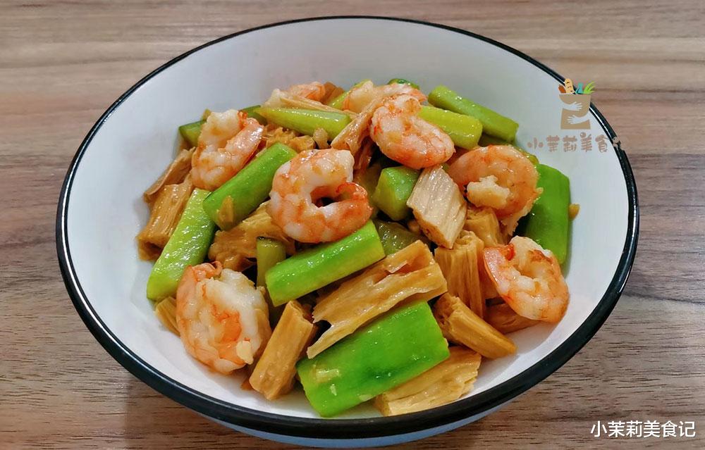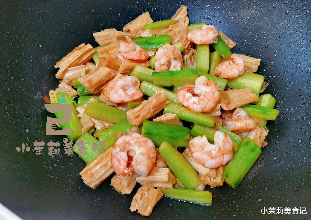 4、接着在底油里边加点蒜和葱,倒入腐竹,黄瓜,先炒透,接着把虾倒里边,调入生抽,盐,继续炒入味,便可以盛出来。