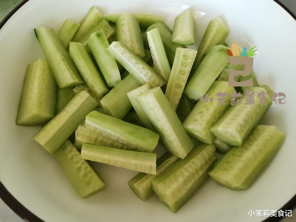 2、一条新鲜的黄瓜,洗净去皮之后,切成小条。